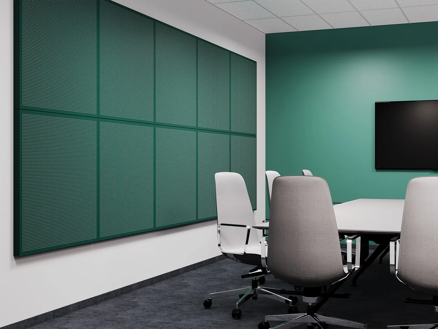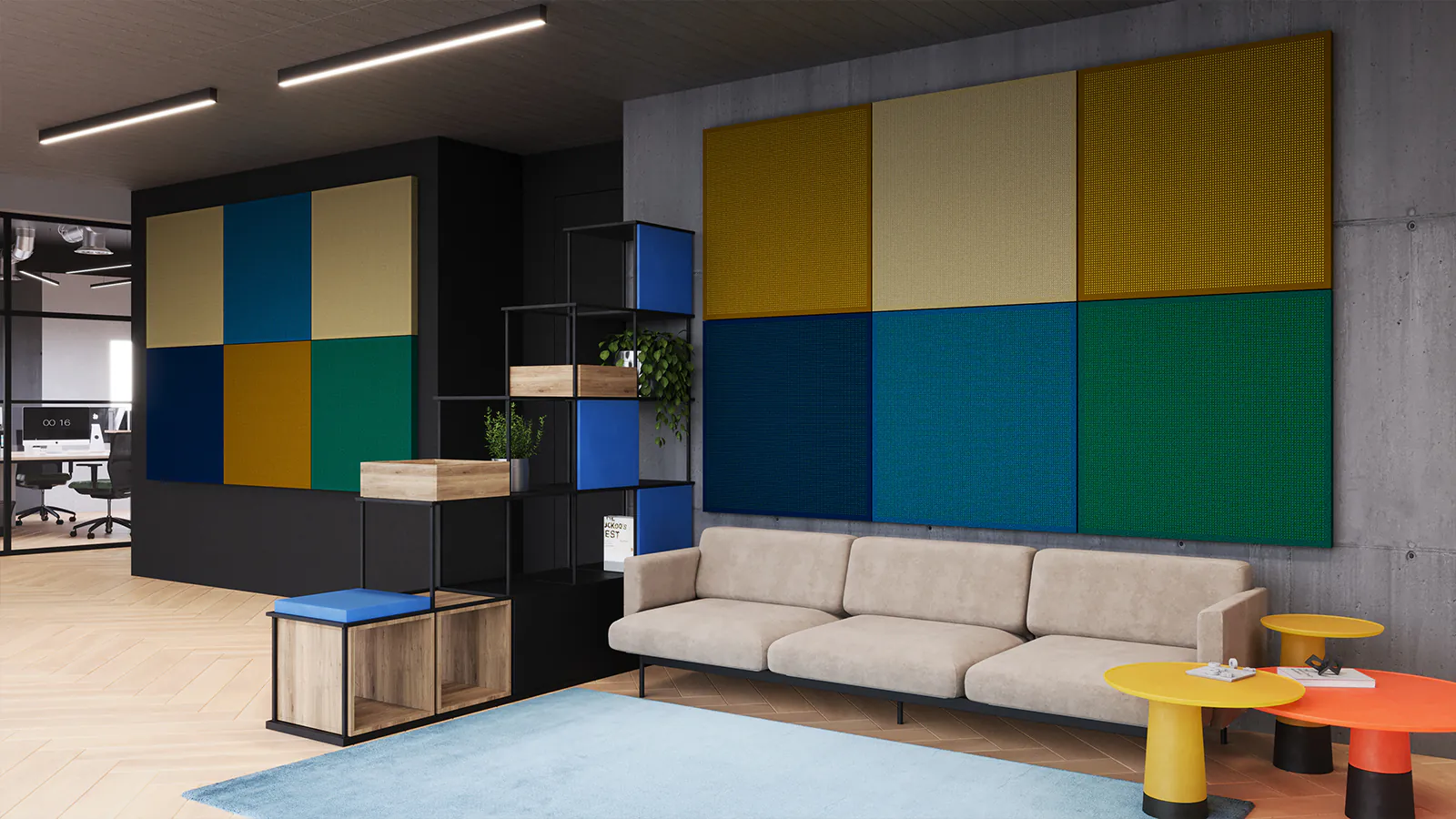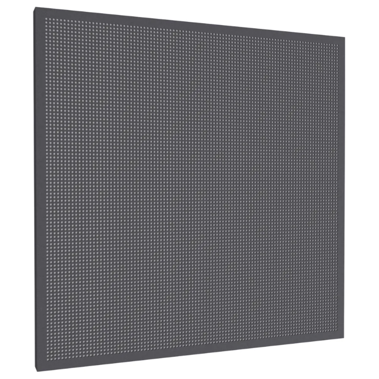 Akustické panely PERFO, navržené speciálně pro kanceláře a veřejné interiéry. Tyto panely vznikají z perforovaných ocelových desek potažených měkkým, barevným povrchem Fluffo, přičemž jejich vnitřní struktura v základních barvách je viditelná skrz dekorativní perforaci. K dispozici jsou v pěti formátech a pyšní se nejvyšší třídou pohlcování zvuku i certifikovanou nehořlavostí.