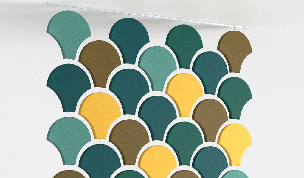 Akustické závěsy Fluffo WEB  jsou ideálním řešením pro interiéry, kde je instalace jiných akustických materiálů omezená. Díky své lehké, otevřené struktuře prostor jemně členicí, zatímco jejich barva a tvar vytvářejí správnou atmosféru interiéru.