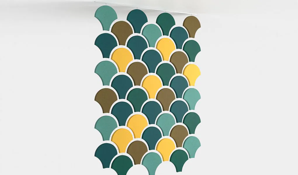 Závěsný akustický panel ‣ velikost 380×382 mm ‣ 49 barev ‣ tloušťka 40 mm ‣ do kanceláří, prostorných chodeb i domácností ‣ výborná akustická účinnost