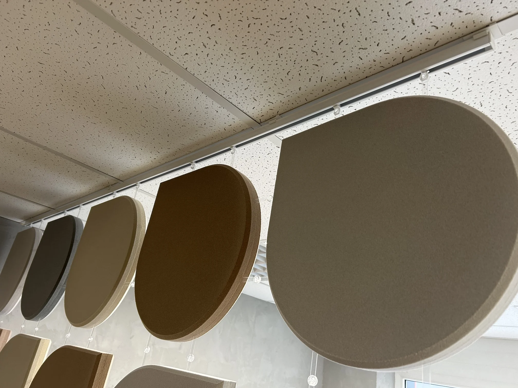 Set na zavěšení do stropu ‣ kolejnice bílá 2m ‣ koncovky kolejnice 2ks ‣ kotvící materiál konzole ‣ držáky akustického panelu
