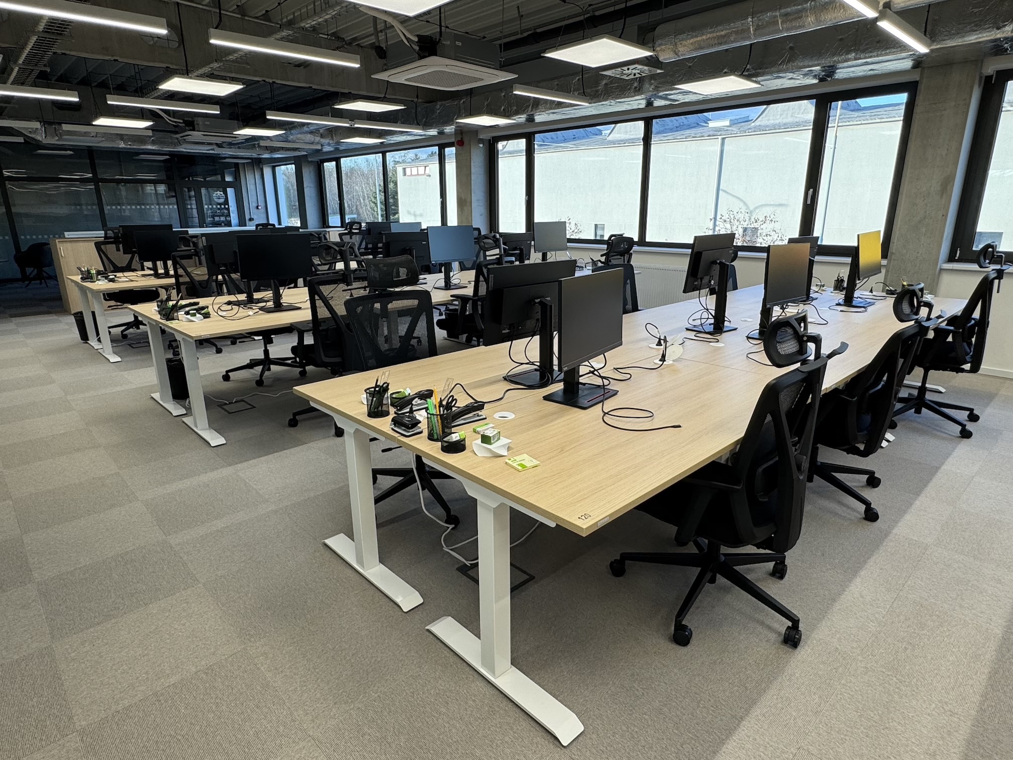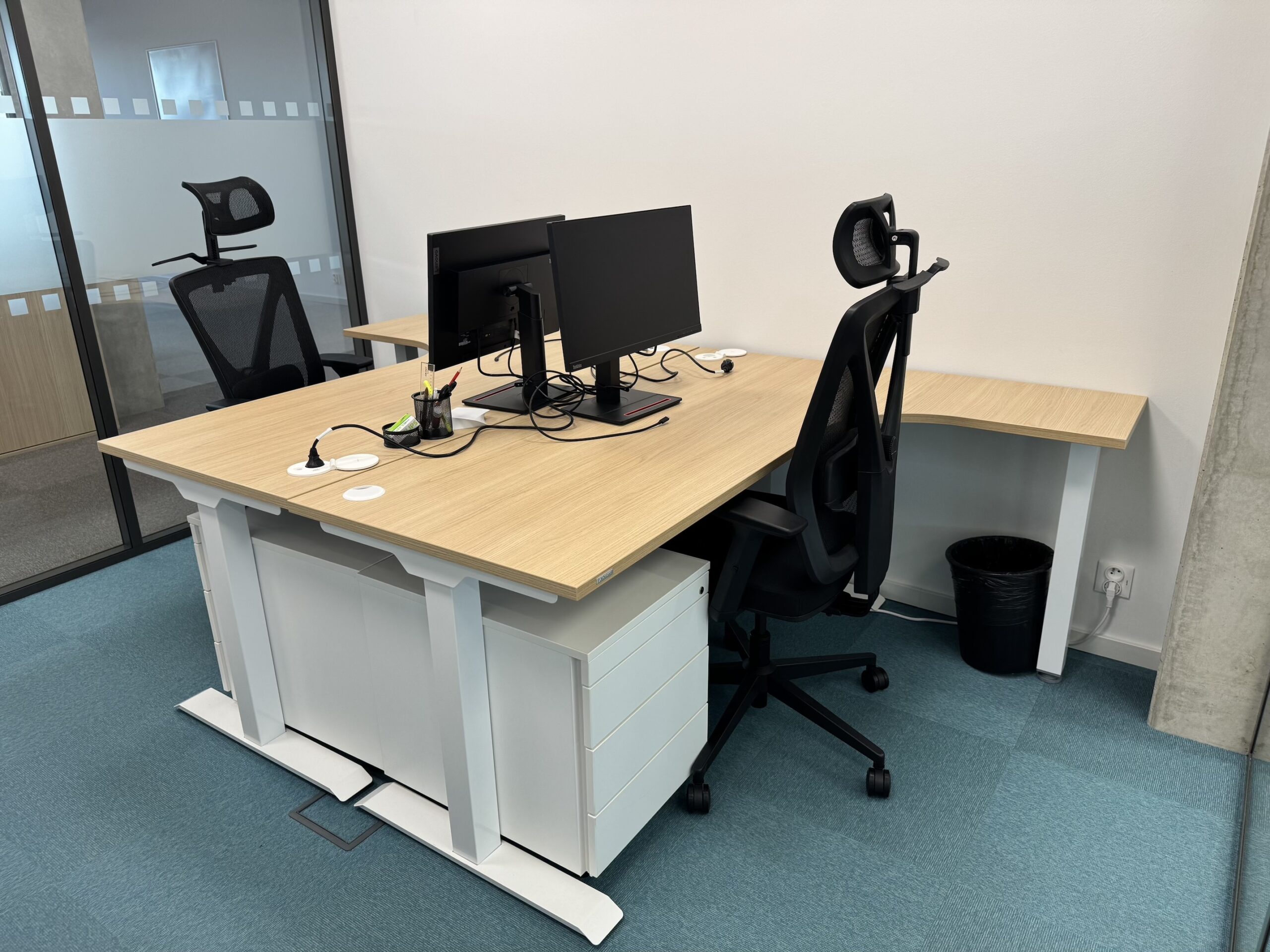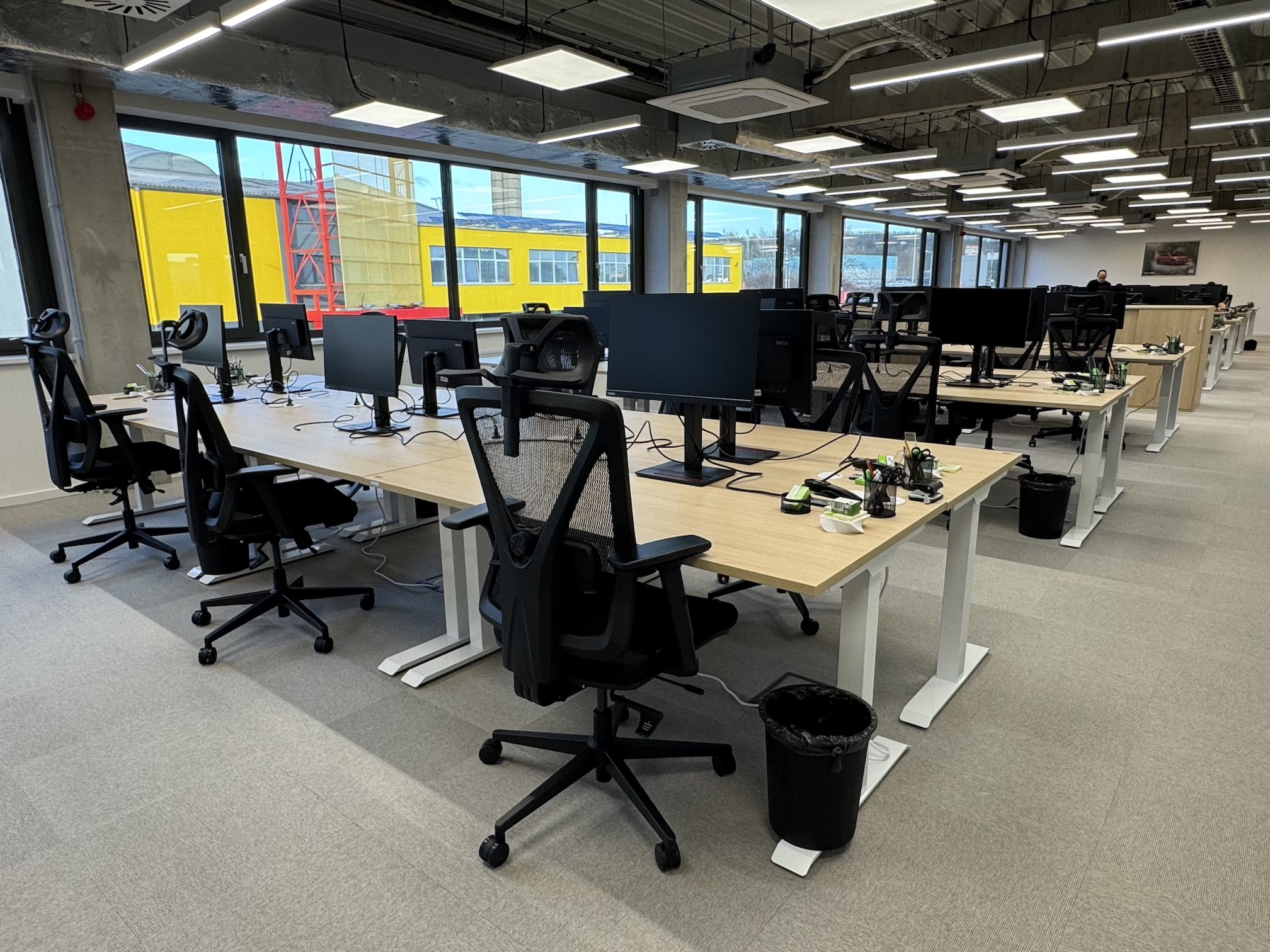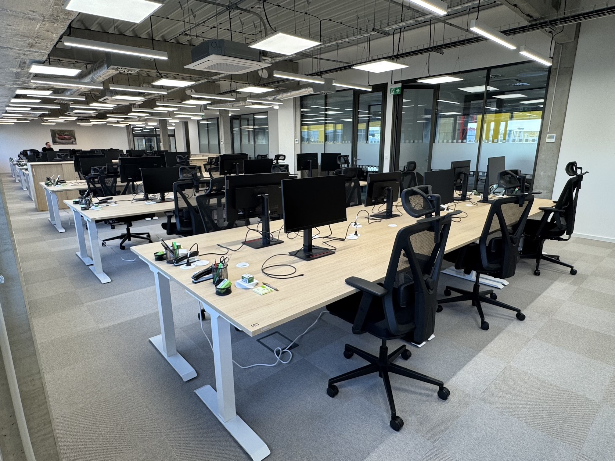 Klíčovou částí realizace byla dodávka kancelářských stolů FIXTER určených pro více než 100 osob. Součástí stolů jsou integrované přípojné zásuvkové moduly, které umožňují komfortní práci s technologiemi a přehledné vedení kabeláže. Pracoviště doplňují ergonomické židle Kolinn, zajišťující celodenní pohodlí a podporu zdravého sezení.