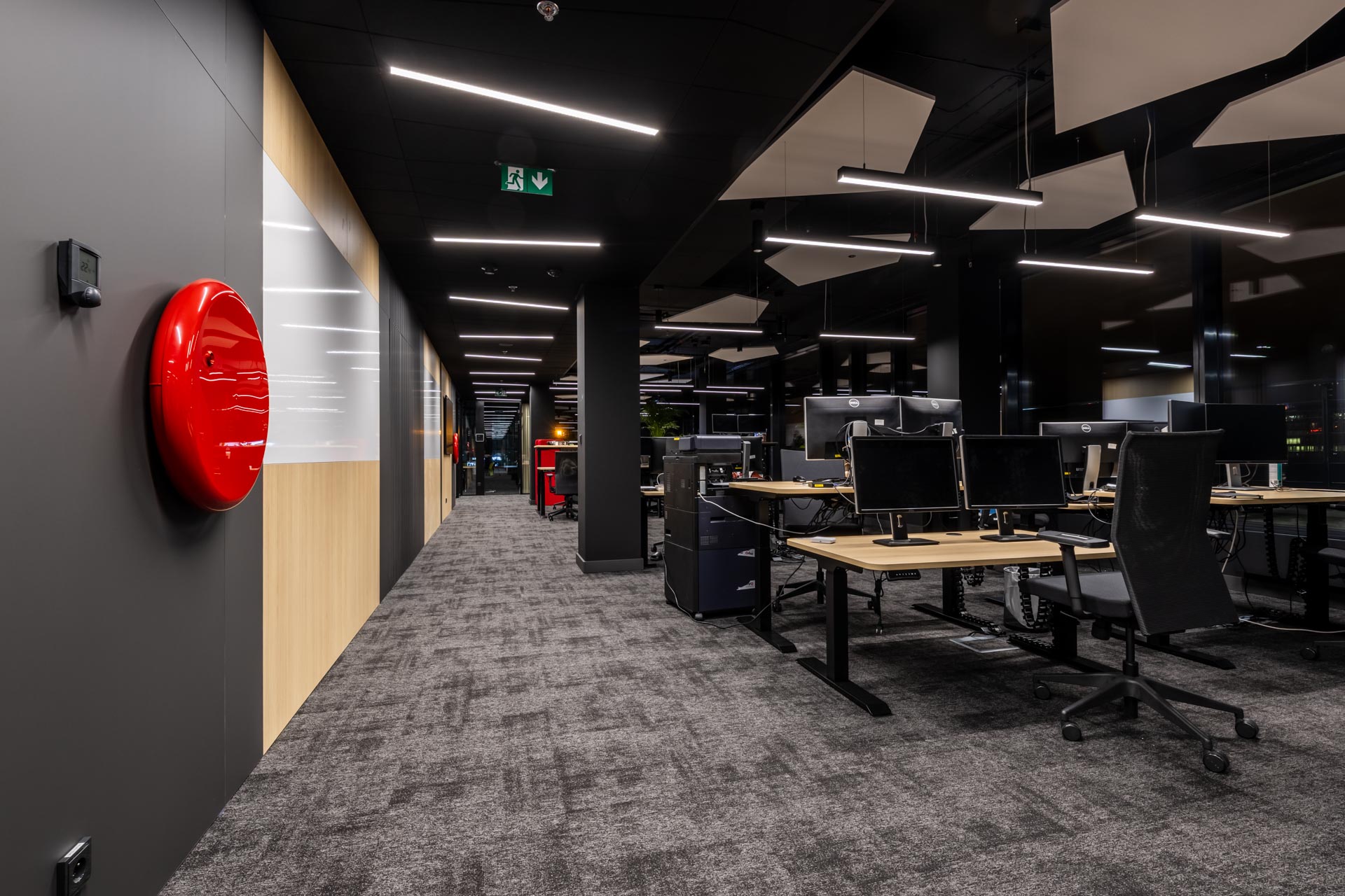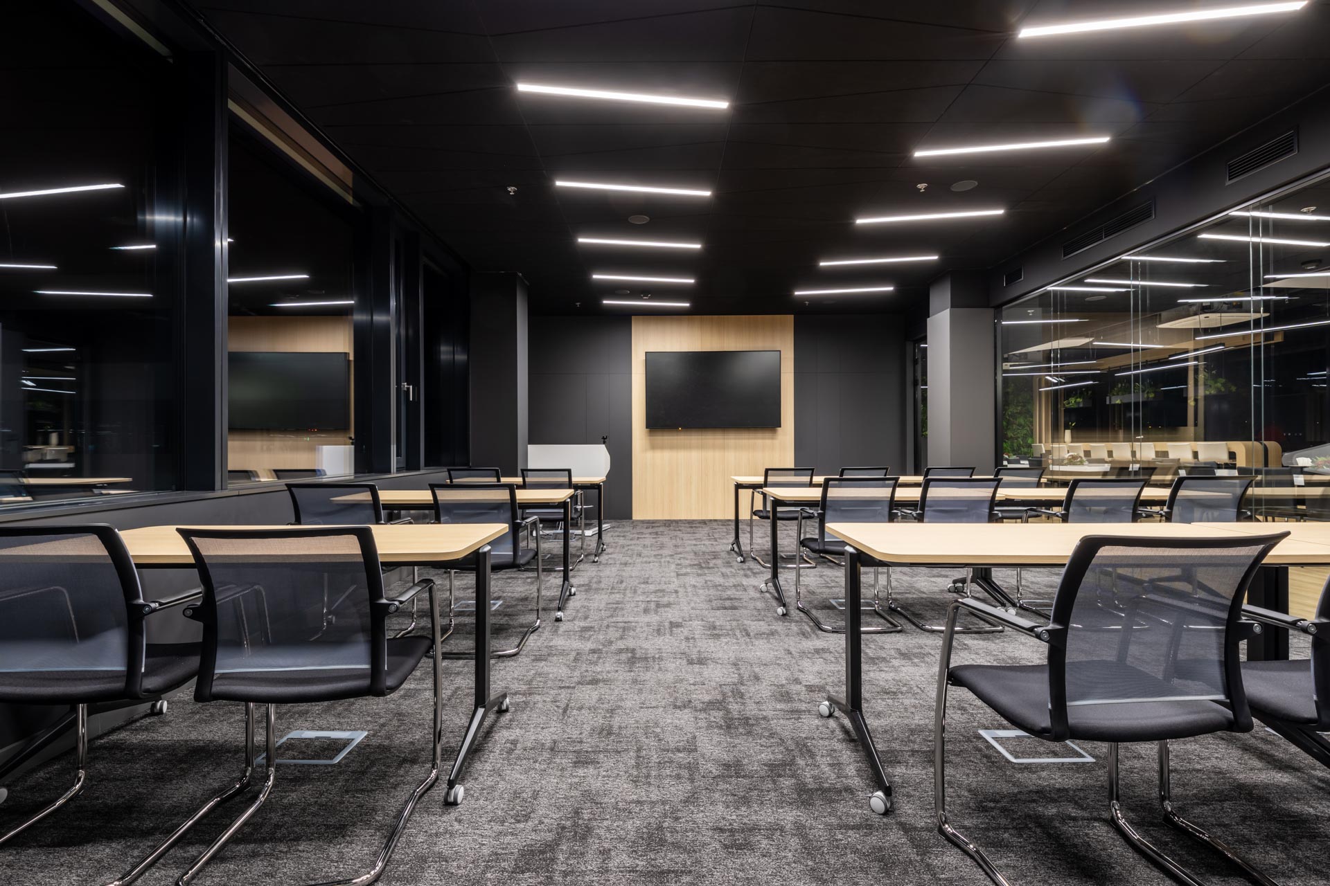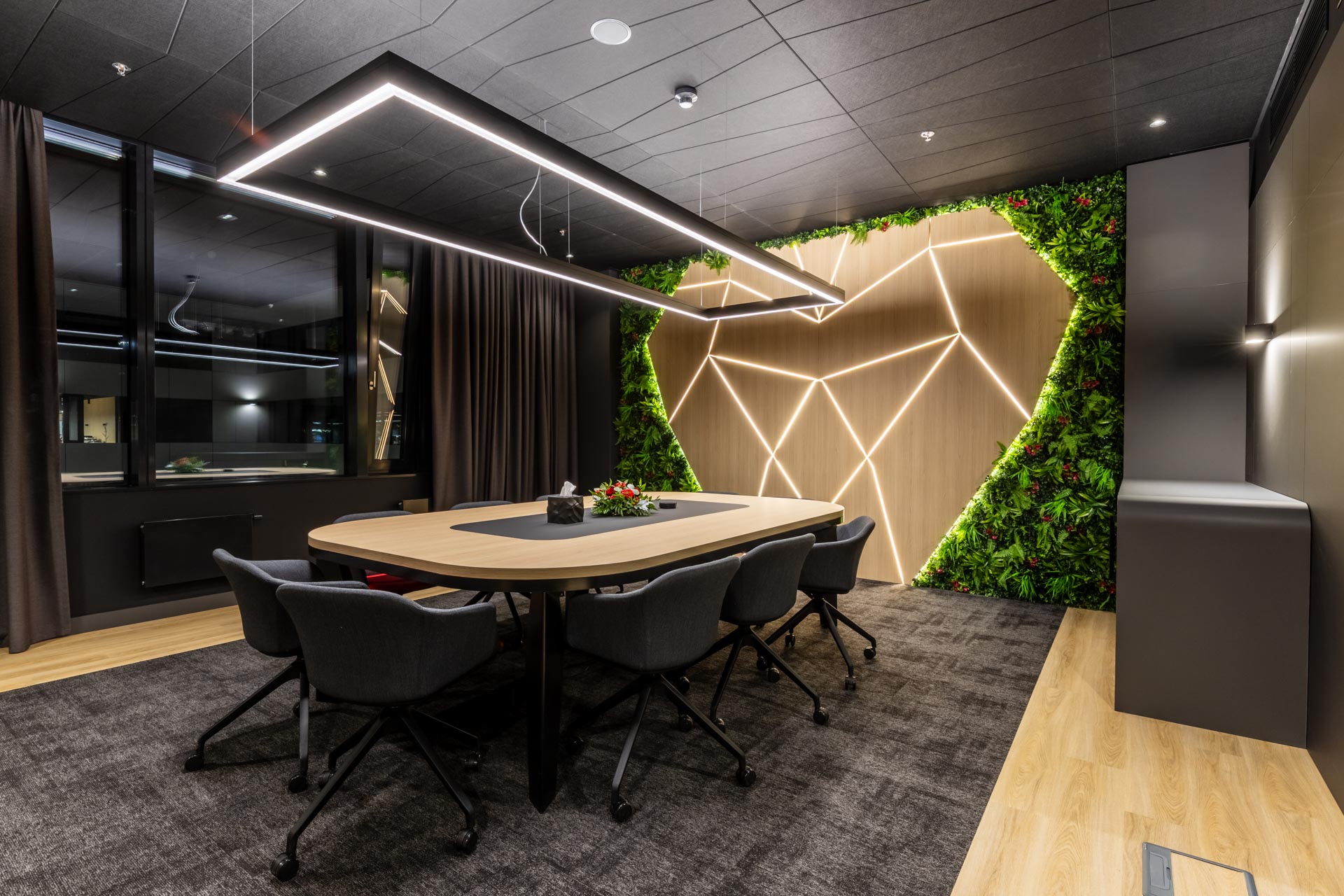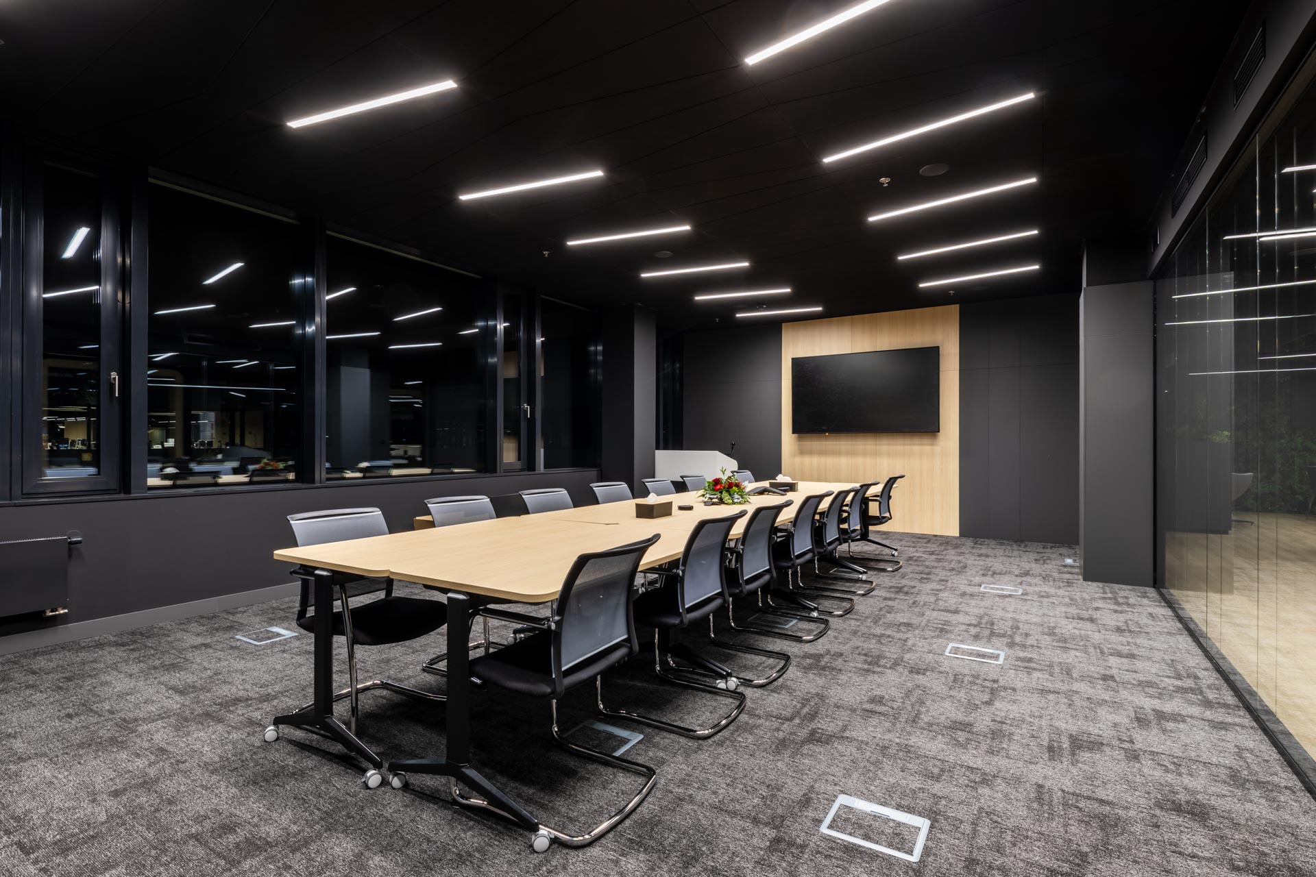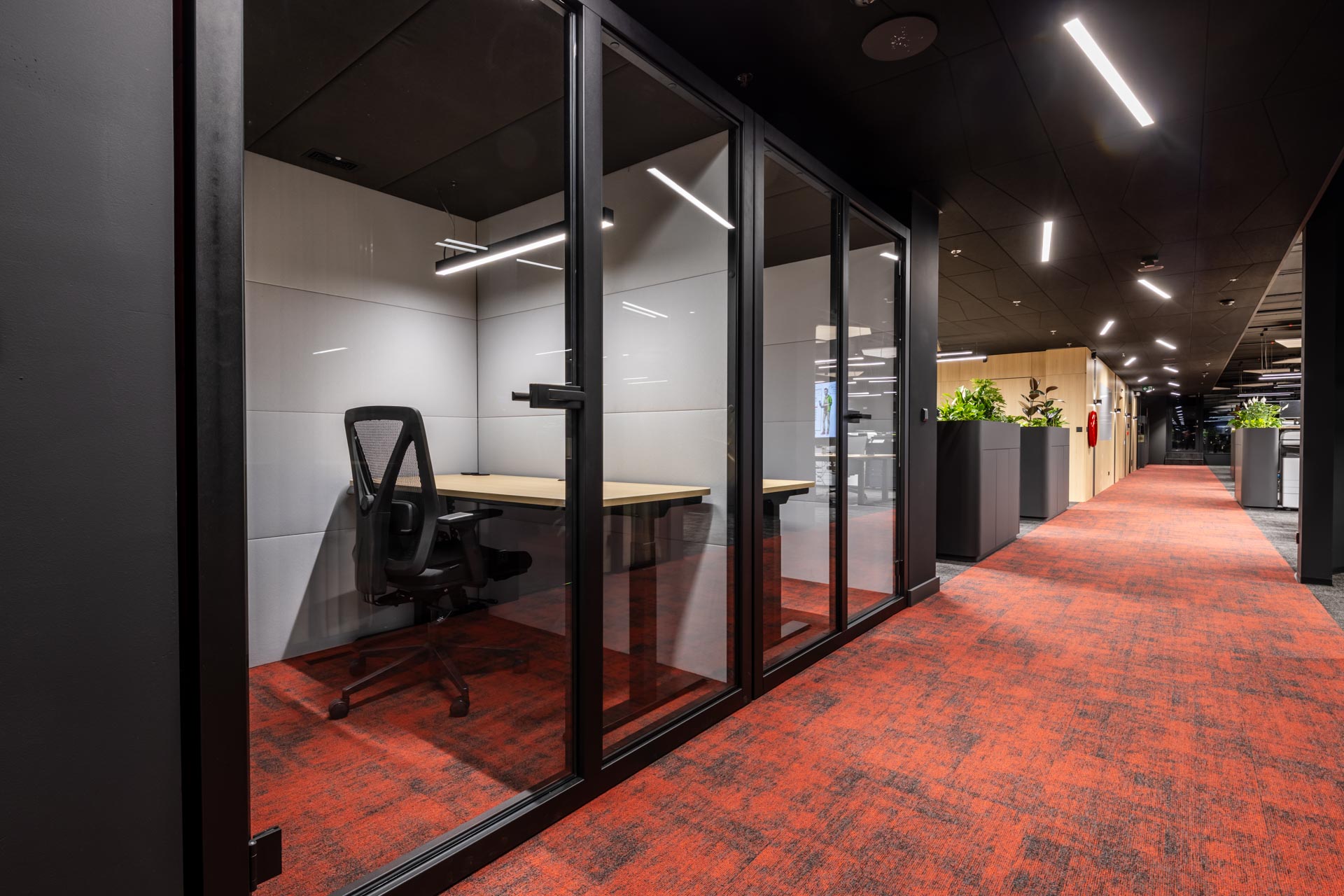 Projekt jsme převzali ve fázi hrubé stavby a proměnili ji v plně funkční, moderní a inspirativní pracovní prostředí. Součástí realizace byly podlahy, zaklopené stropy, stěny s obklady, akustické budky i akustické příčky a stěny v zasedacích místnostech. Do všech kanceláří jsme dodali výškově nastavitelné pracovní stoly a ergonomické židle, do zasedacích místností pak designové stoly a jednací židle.