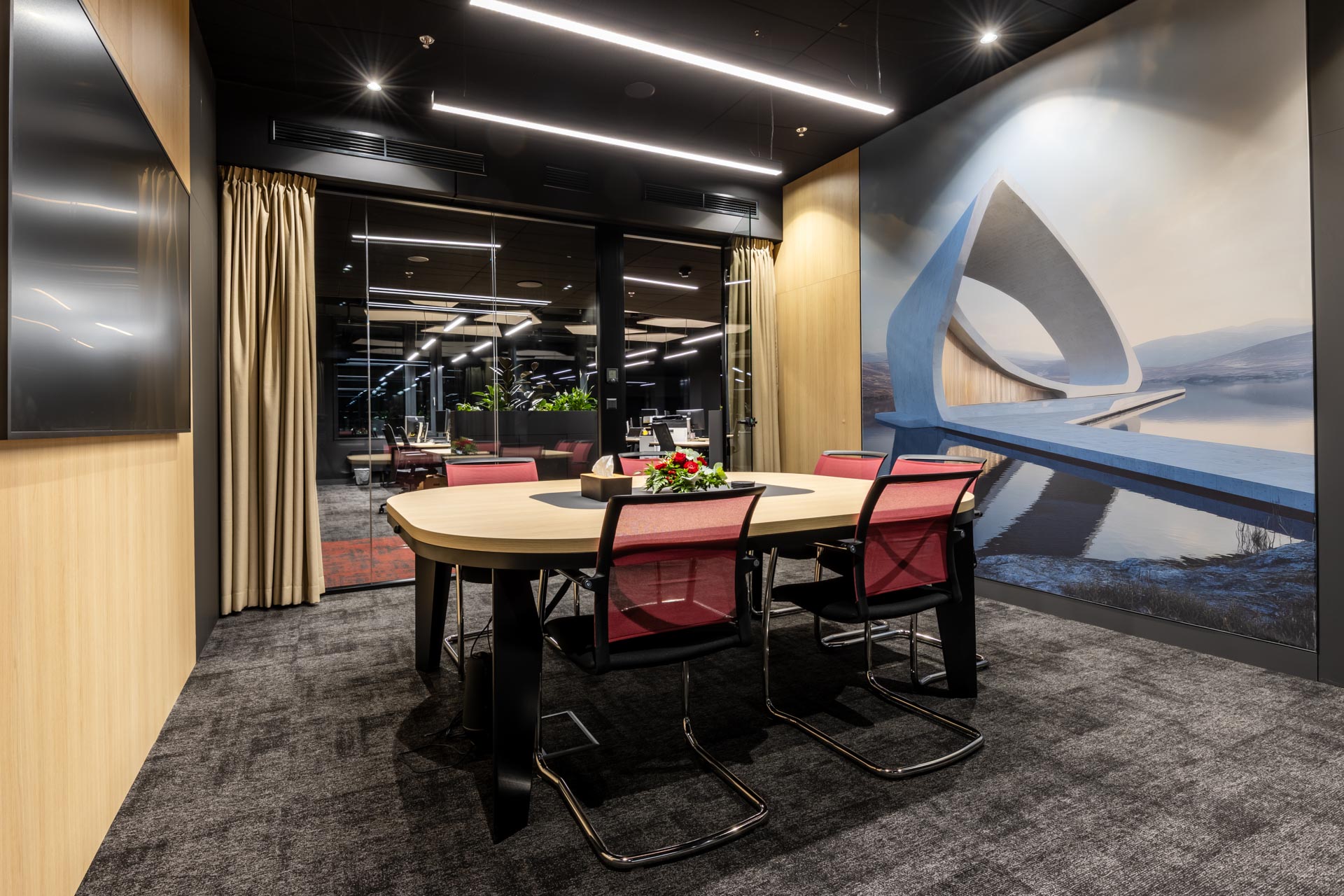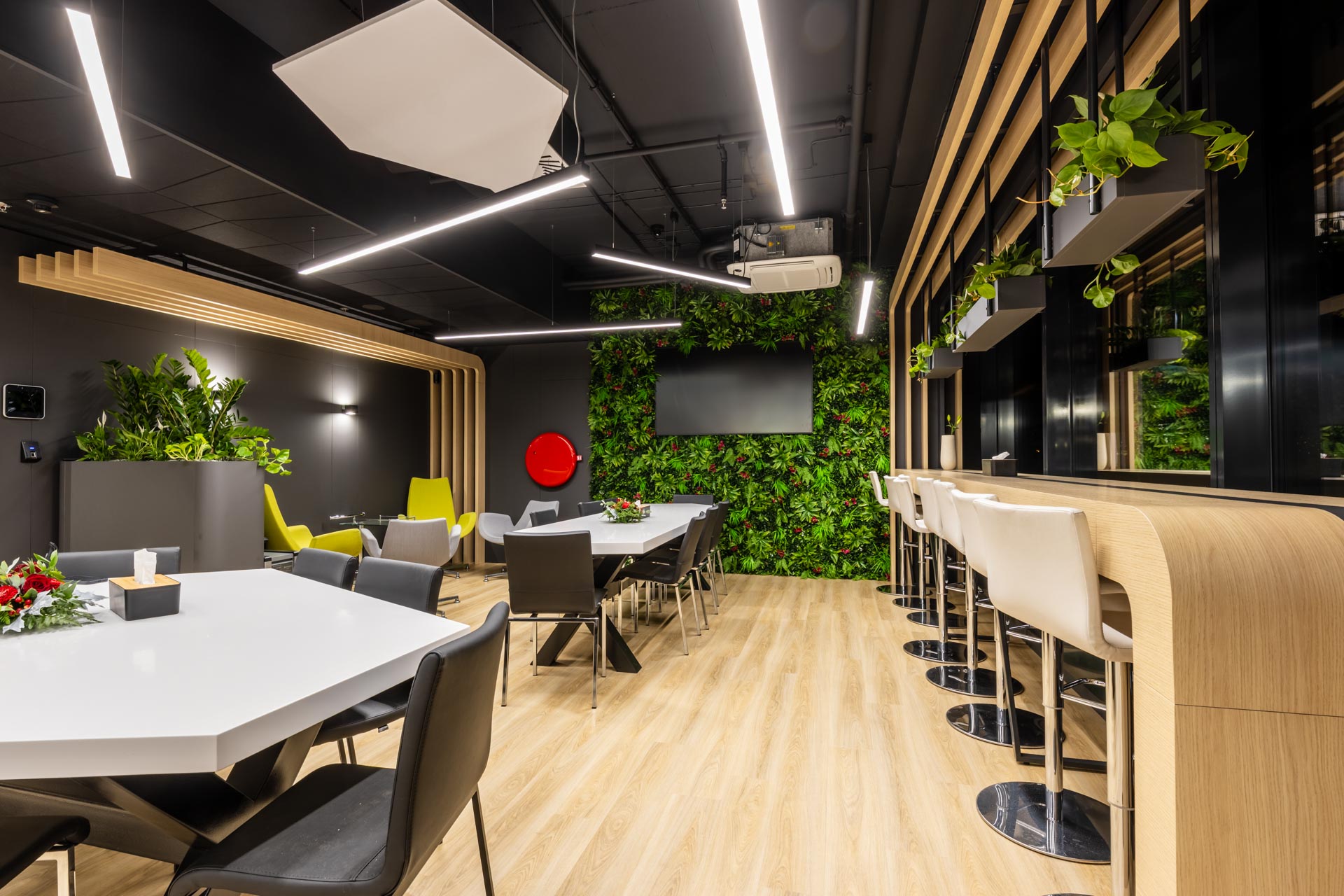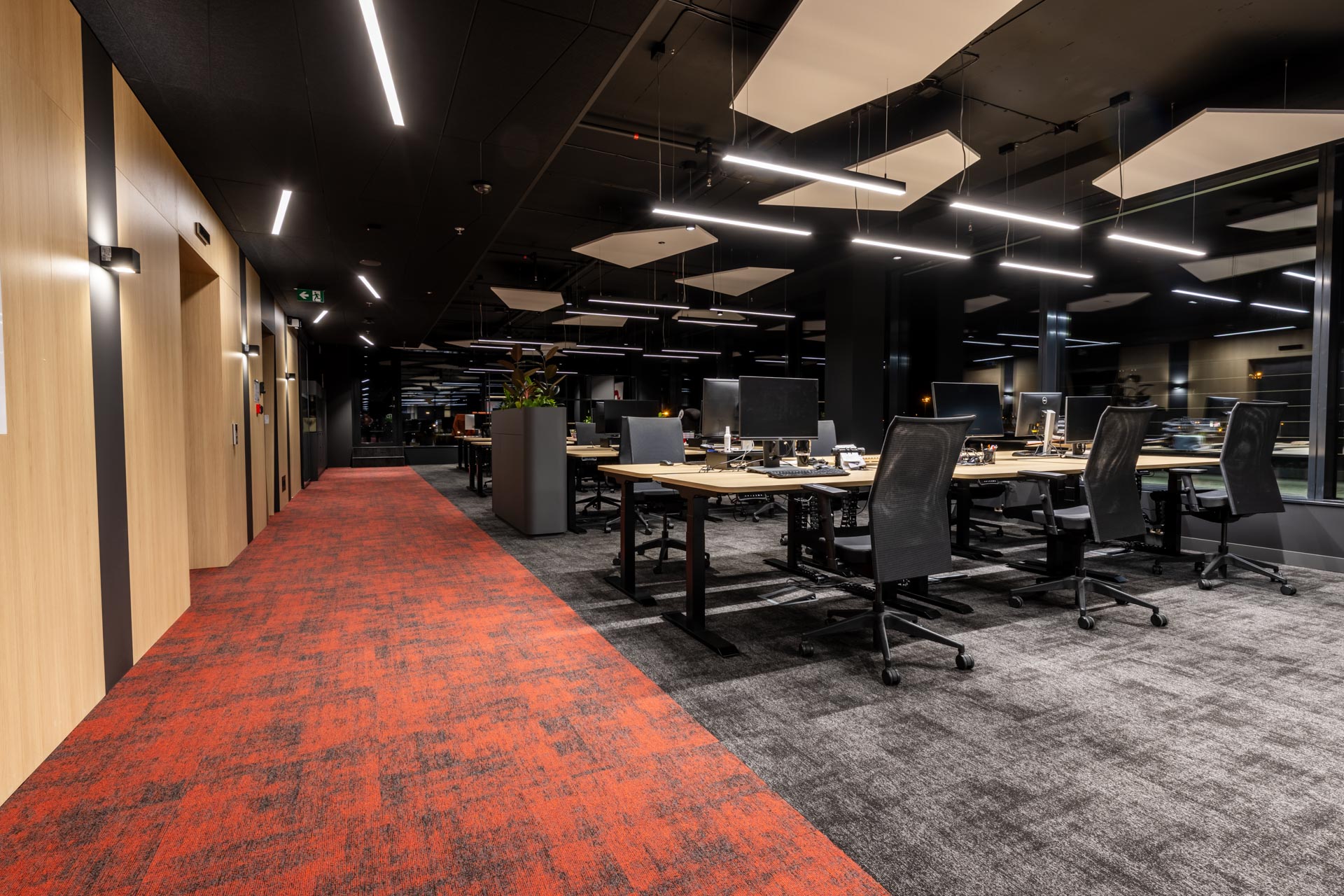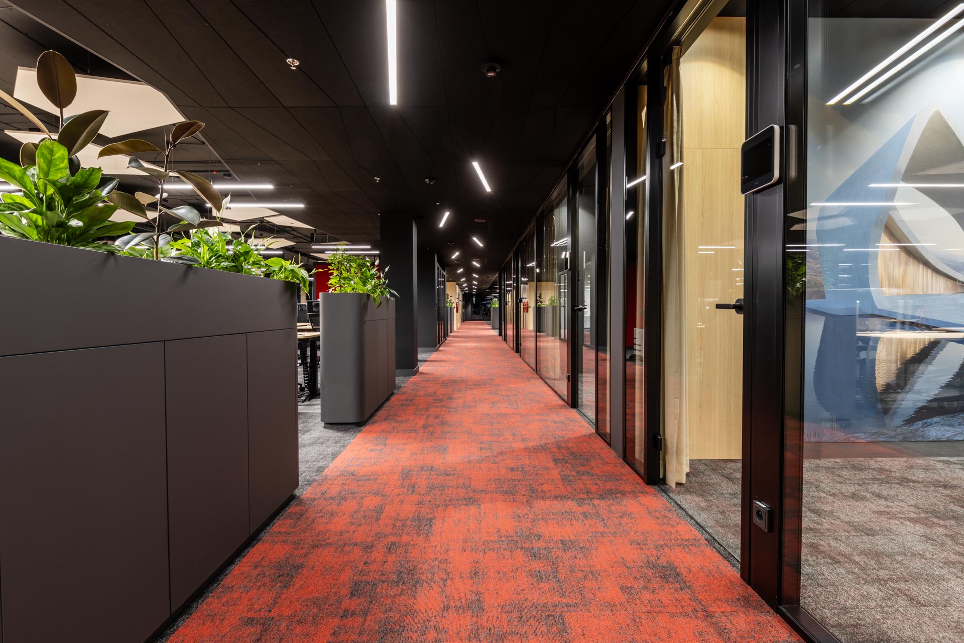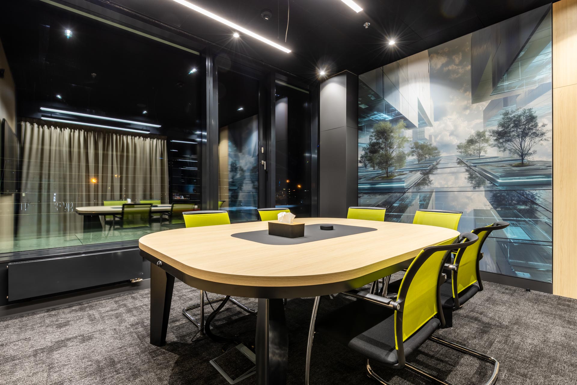 Projekt jsme převzali ve fázi hrubé stavby a proměnili ji v plně funkční, moderní a inspirativní pracovní prostředí. Součástí realizace byly podlahy, zaklopené stropy, stěny s obklady, akustické budky i akustické příčky a stěny v zasedacích místnostech. Do všech kanceláří jsme dodali výškově nastavitelné pracovní stoly a ergonomické židle, do zasedacích místností pak designové stoly a jednací židle.