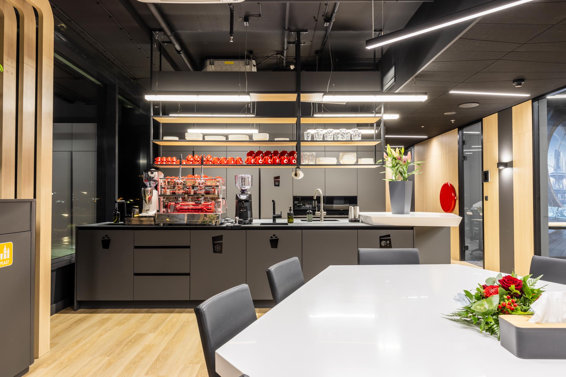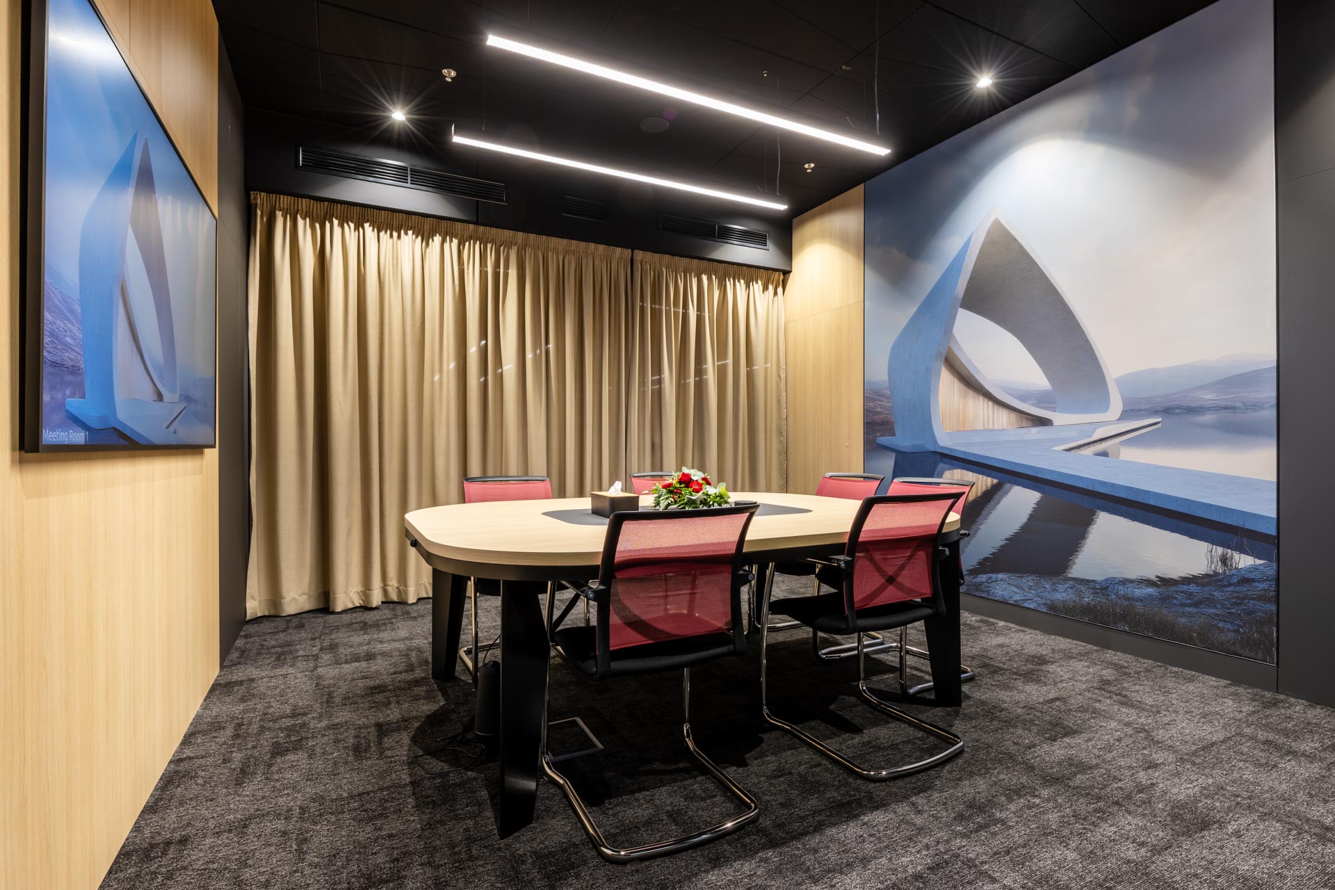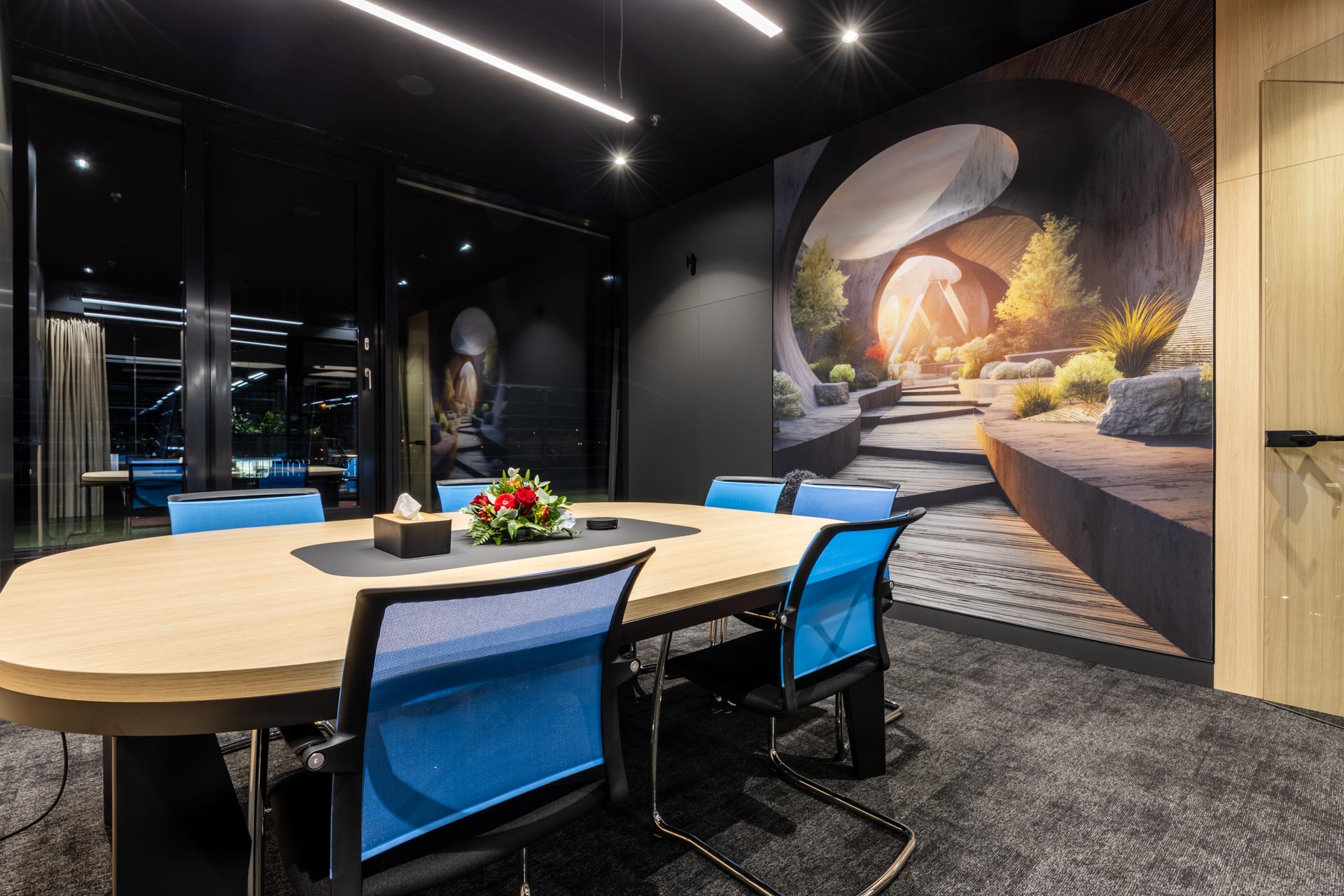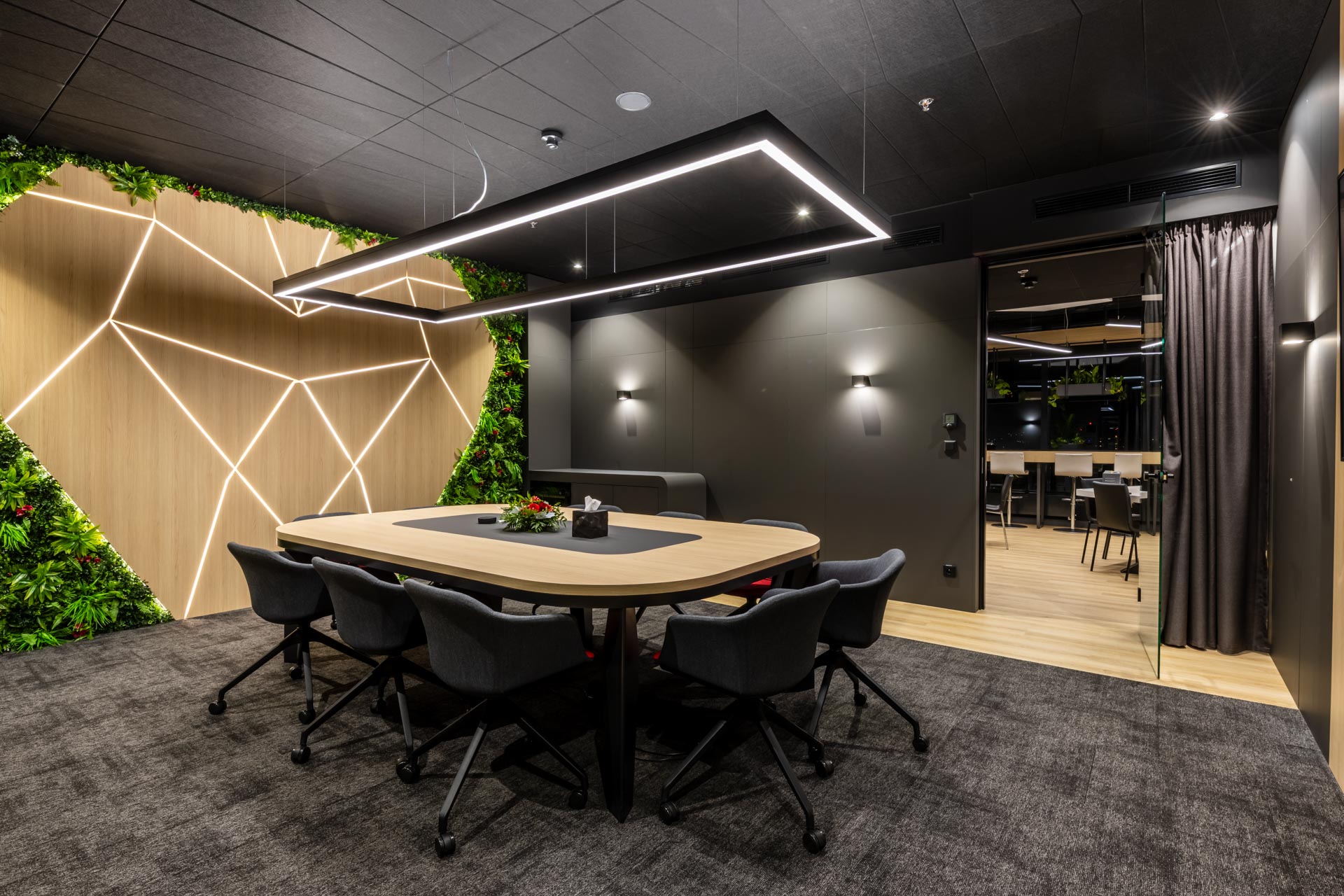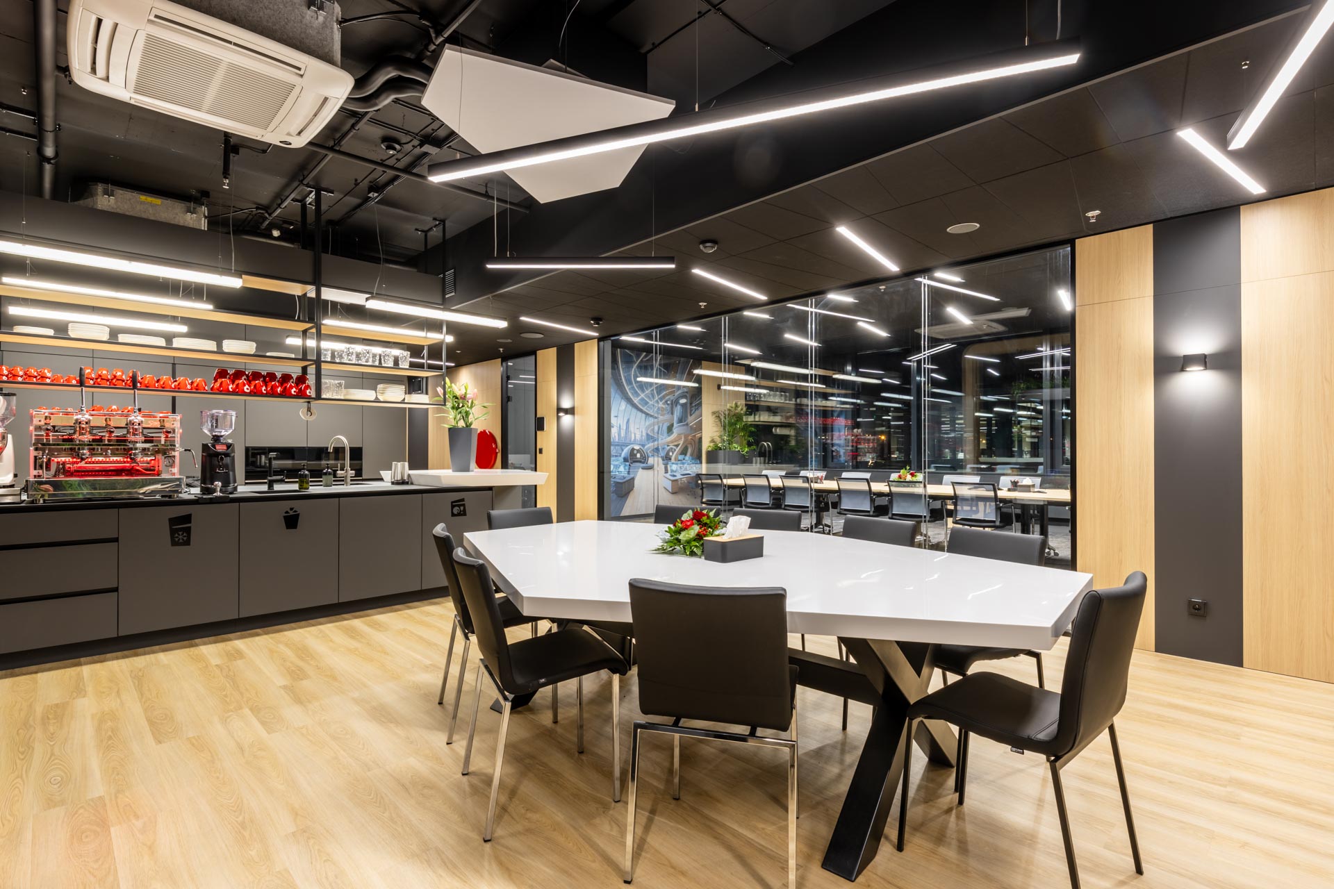 Projekt jsme převzali ve fázi hrubé stavby a proměnili ji v plně funkční, moderní a inspirativní pracovní prostředí. Součástí realizace byly podlahy, zaklopené stropy, stěny s obklady, akustické budky i akustické příčky a stěny v zasedacích místnostech. Do všech kanceláří jsme dodali výškově nastavitelné pracovní stoly a ergonomické židle, do zasedacích místností pak designové stoly a jednací židle.