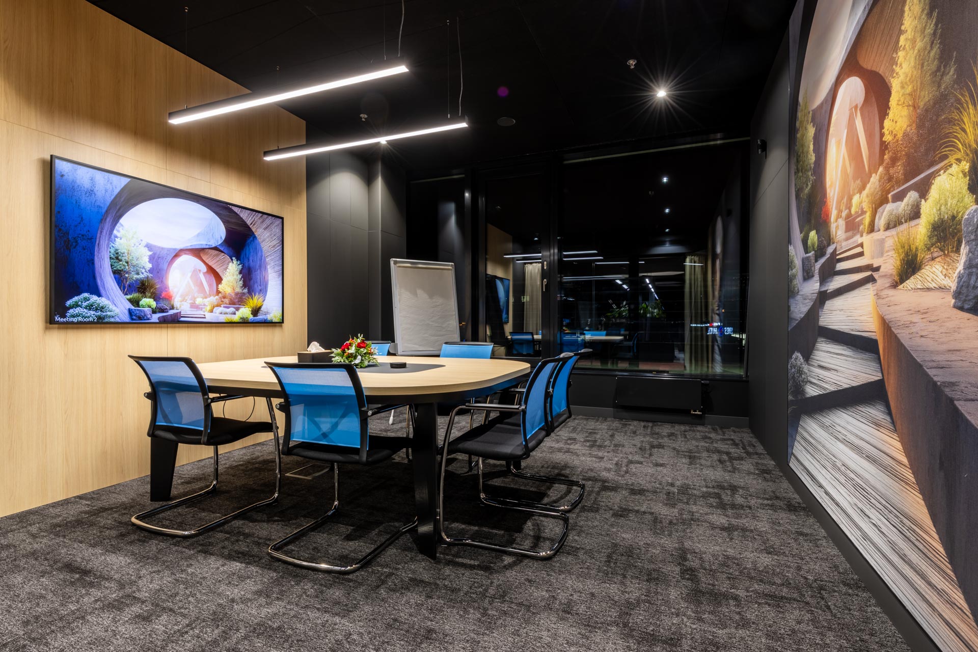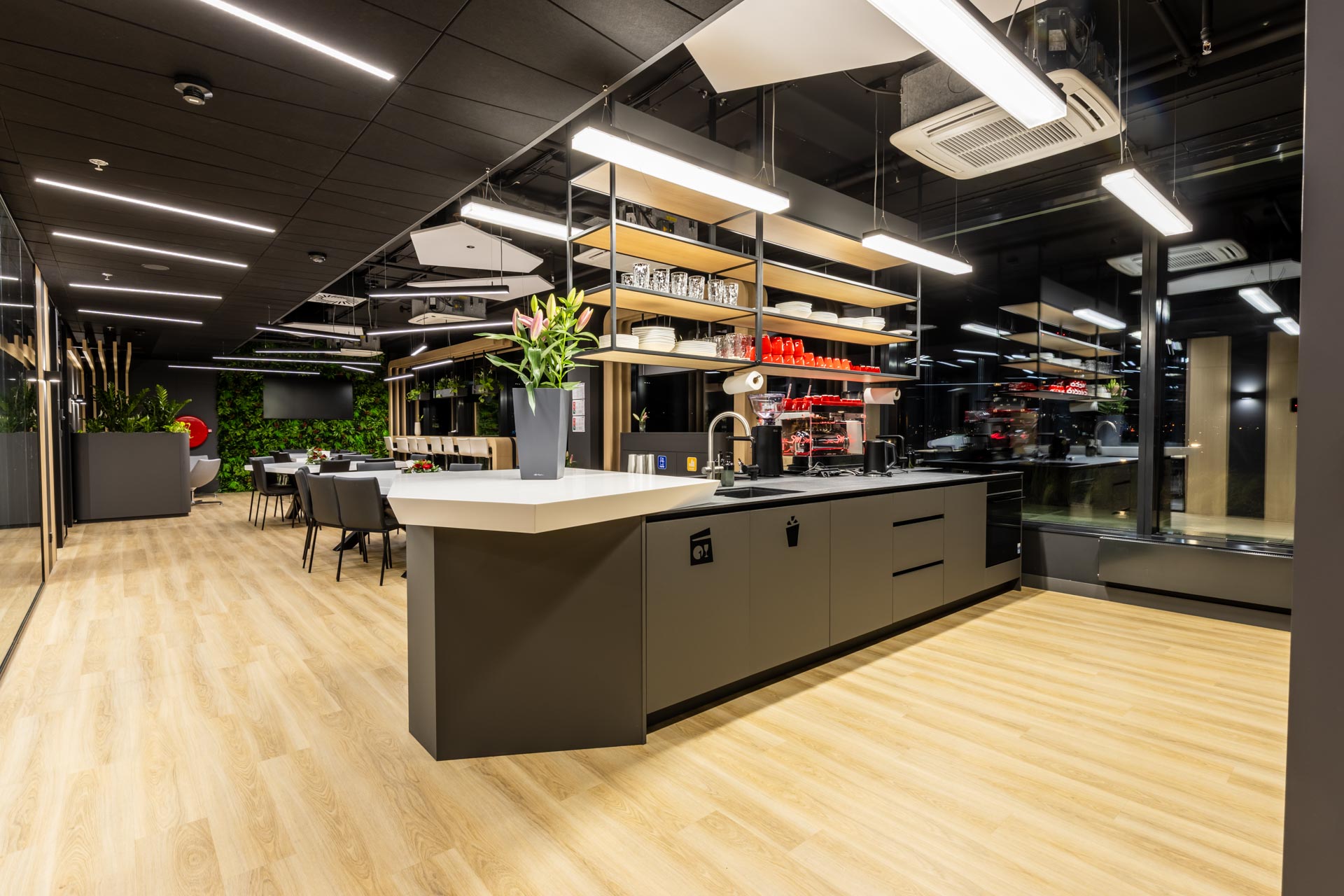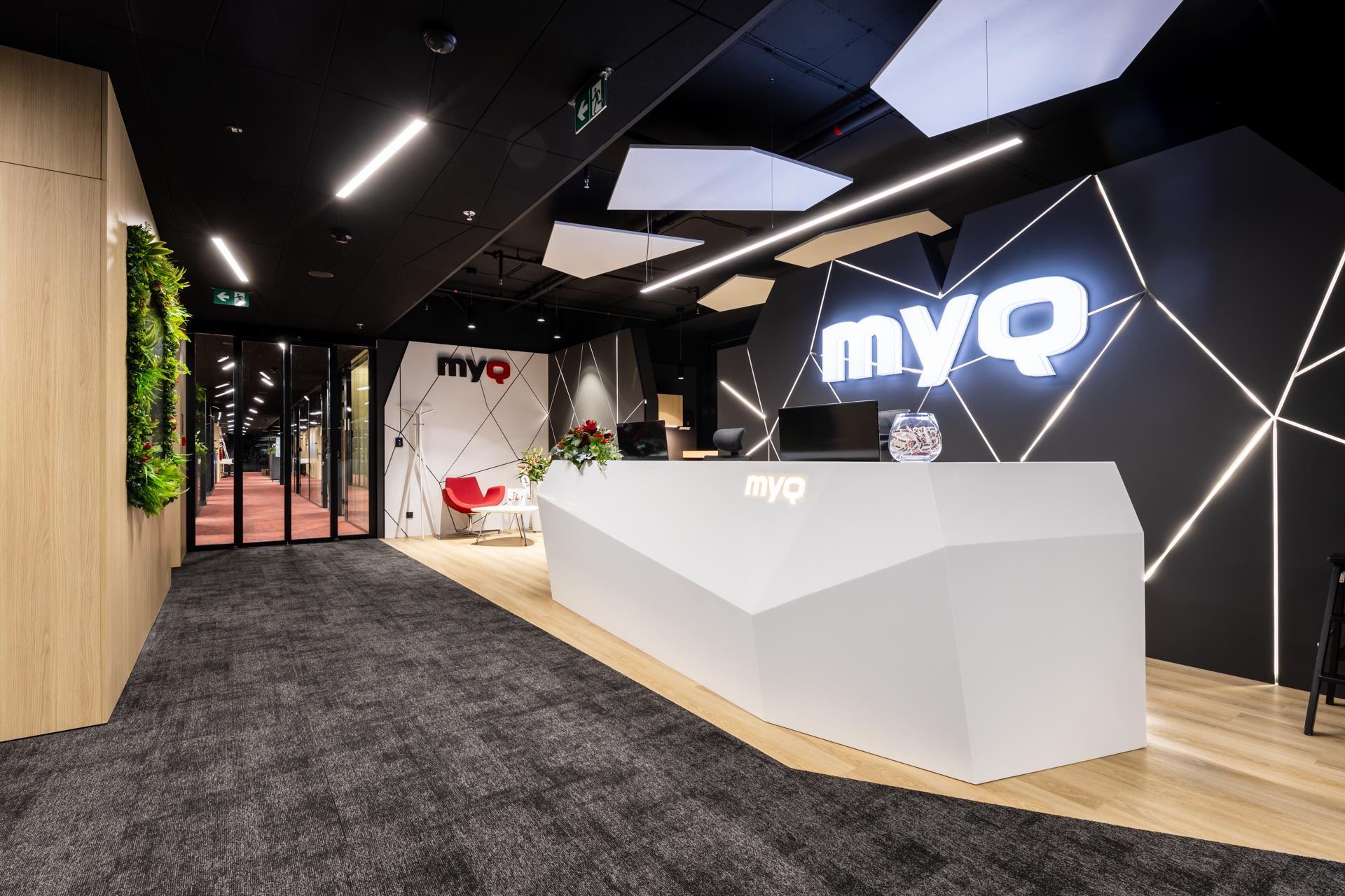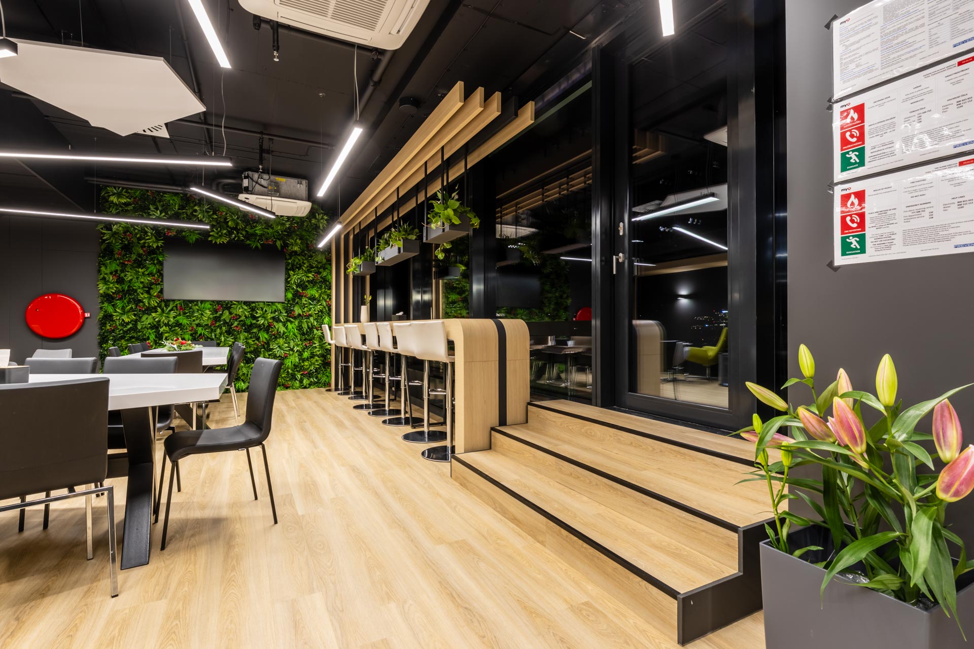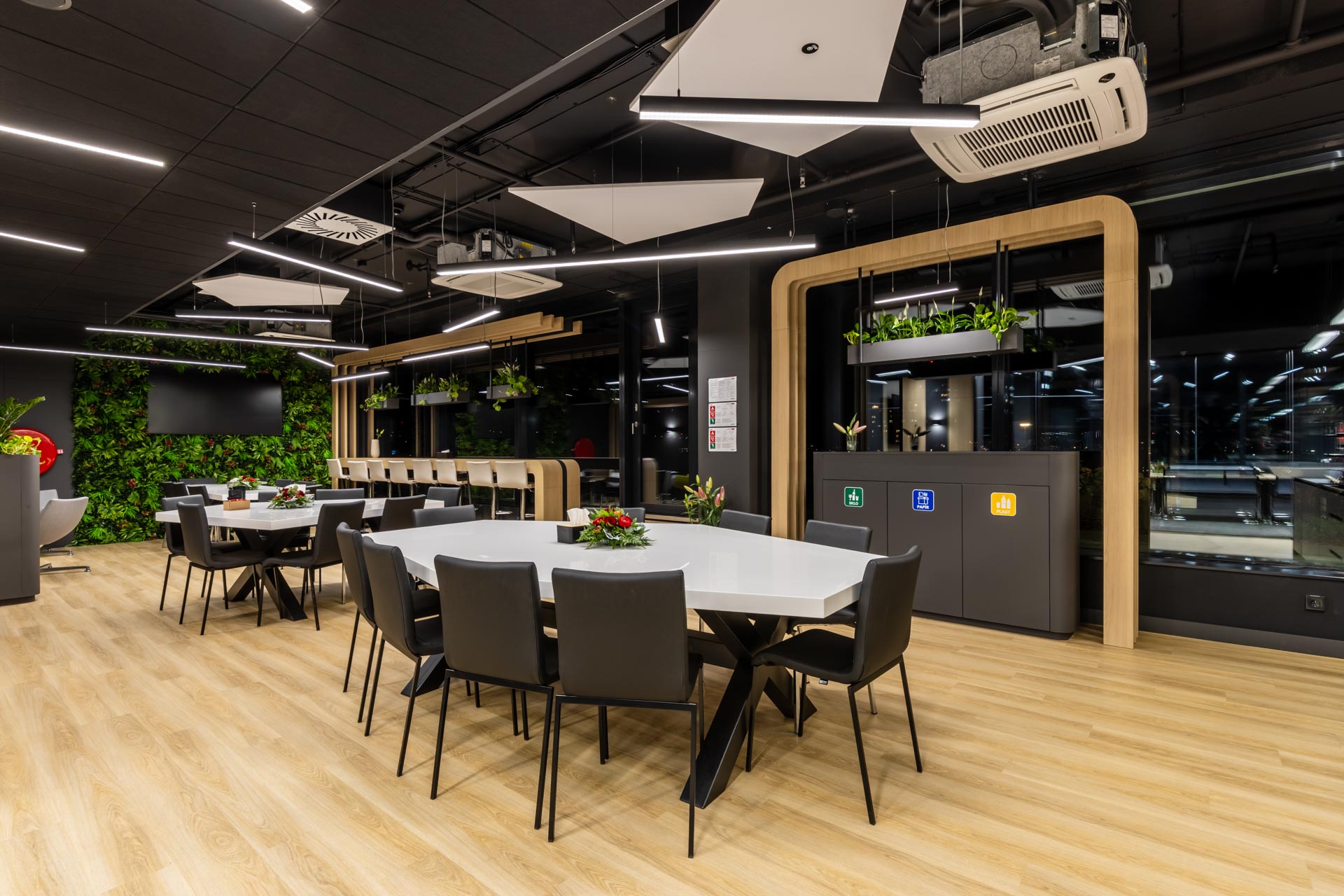 Projekt jsme převzali ve fázi hrubé stavby a proměnili ji v plně funkční, moderní a inspirativní pracovní prostředí. Součástí realizace byly podlahy, zaklopené stropy, stěny s obklady, akustické budky i akustické příčky a stěny v zasedacích místnostech. Do všech kanceláří jsme dodali výškově nastavitelné pracovní stoly a ergonomické židle, do zasedacích místností pak designové stoly a jednací židle.