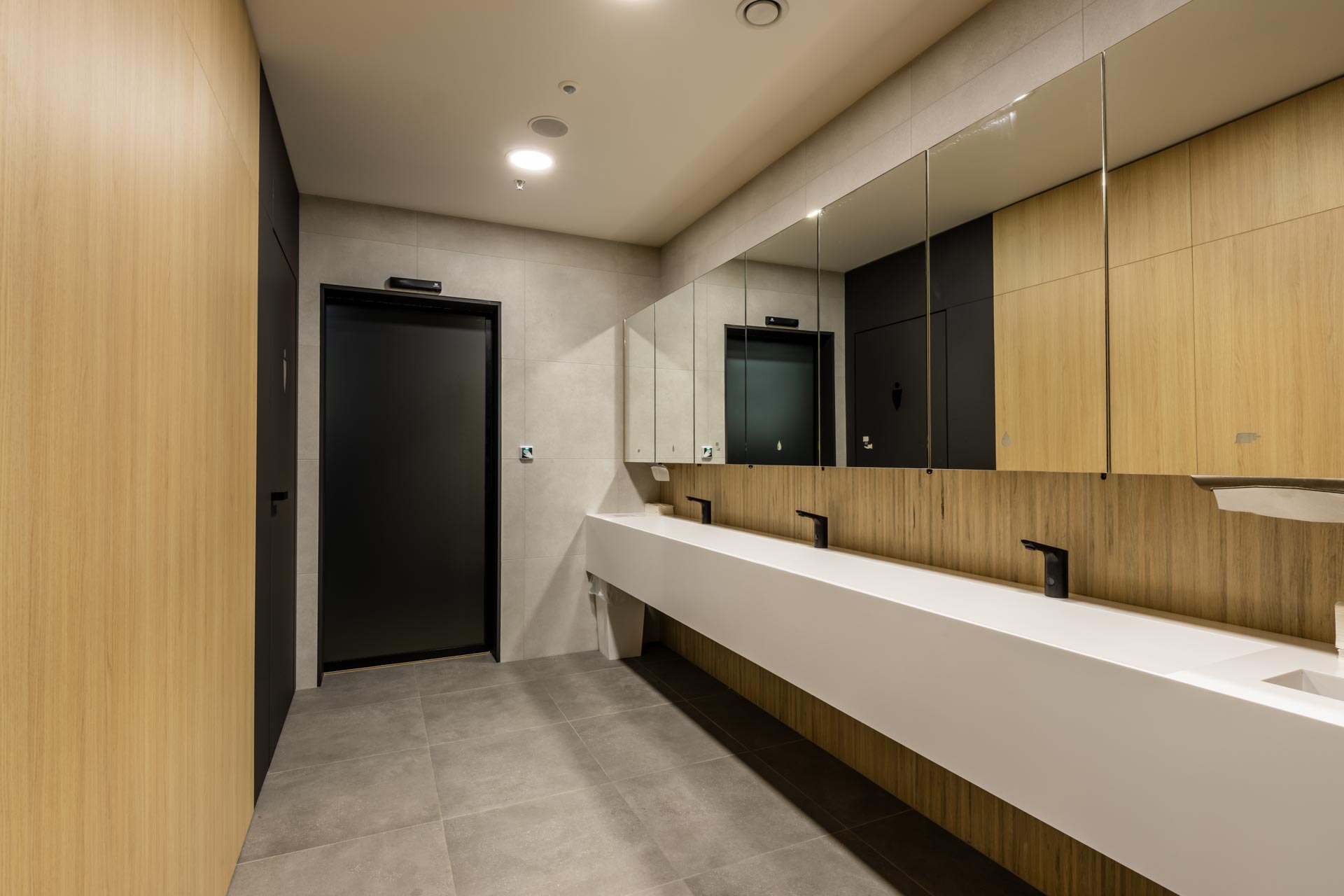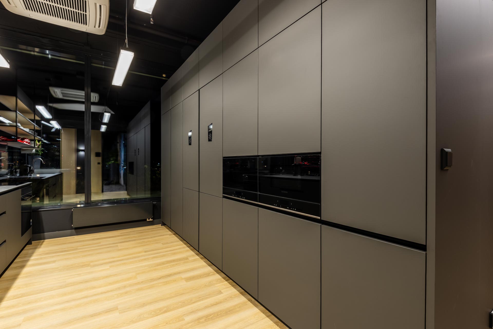 2/ Obklady – kombinace antracitu a dubu Vicenza, které jsou napříč všemi místnostmi i chodbami, součástí obkladů jsou i kovolaminátové popisovatelné tabule