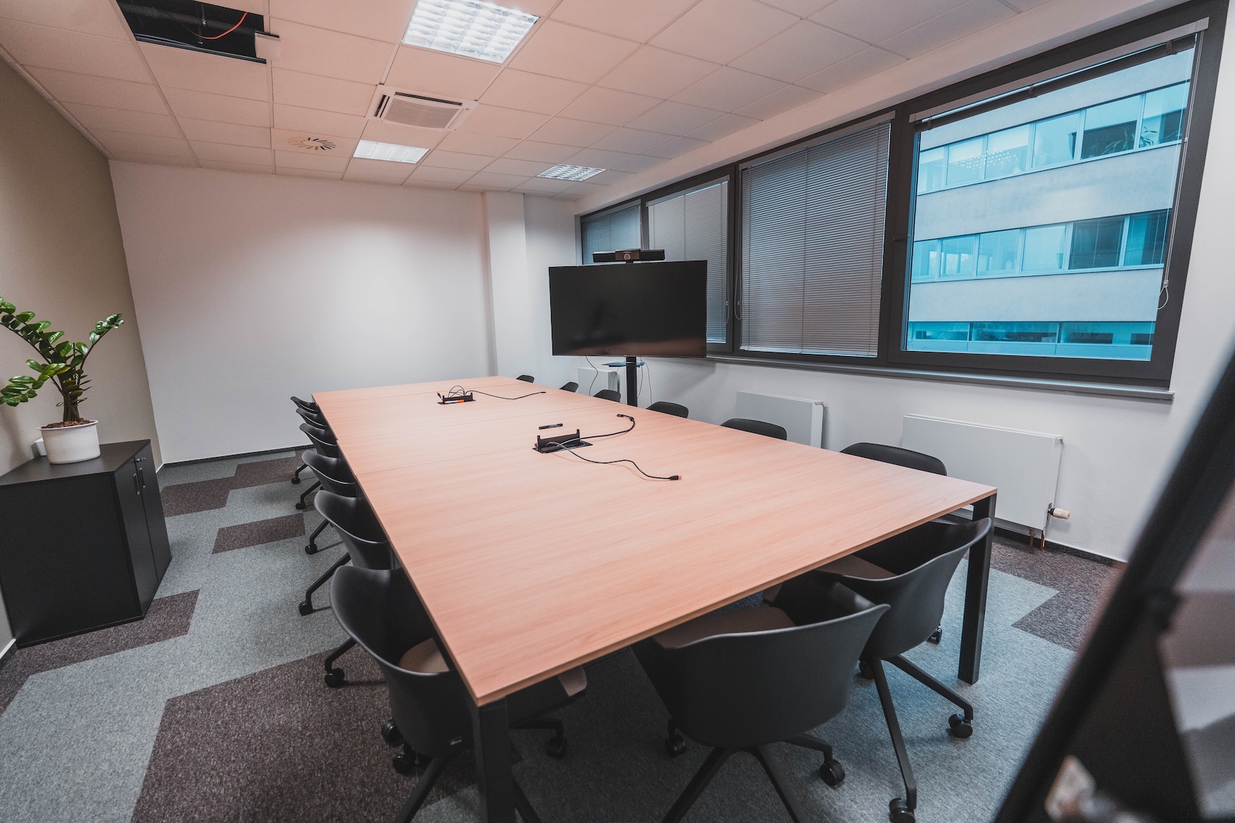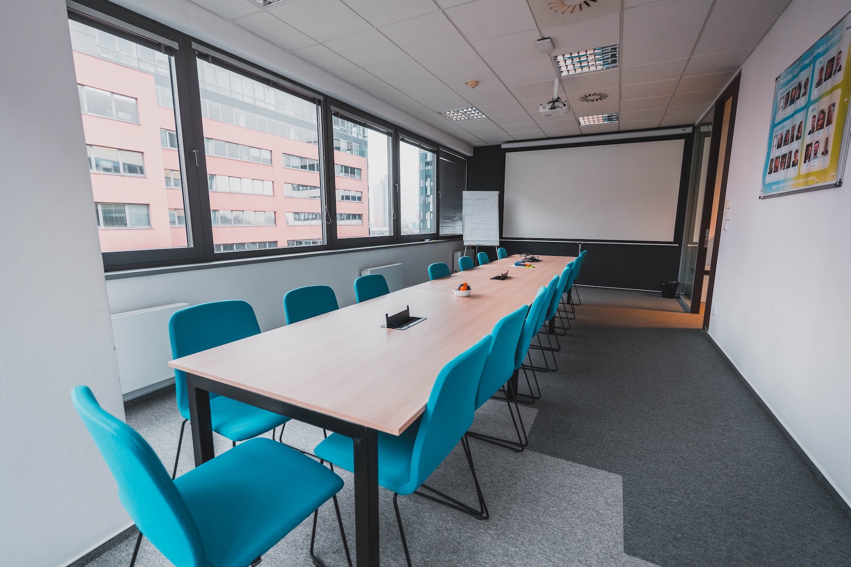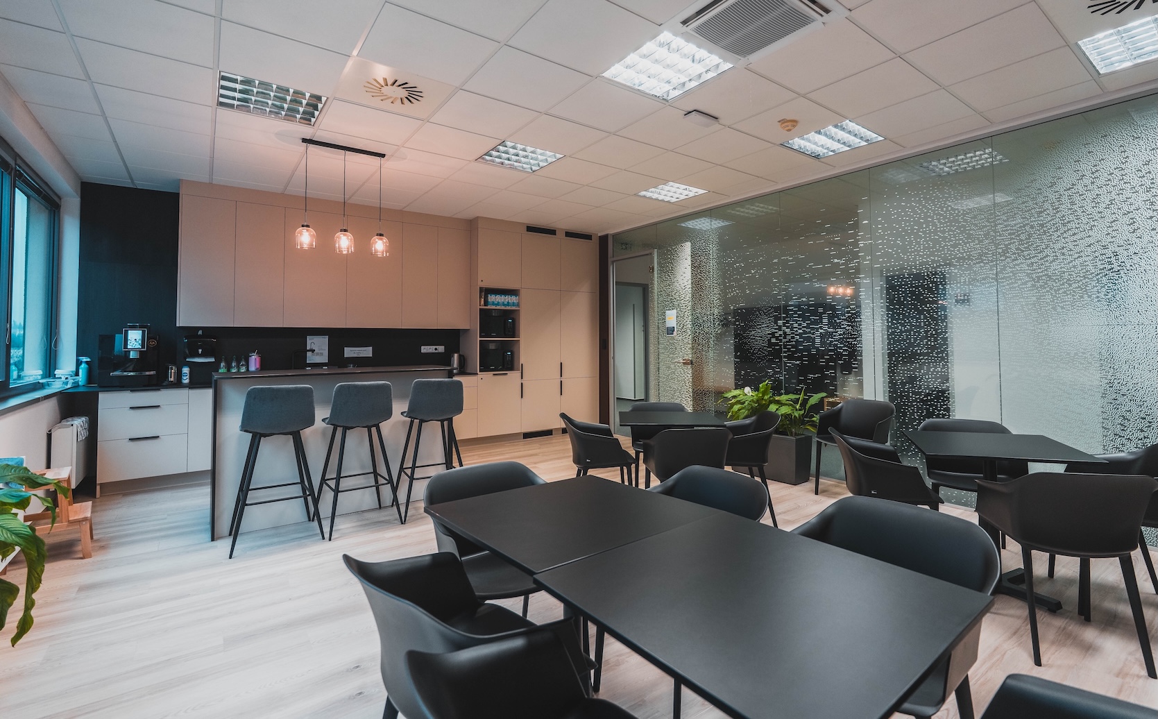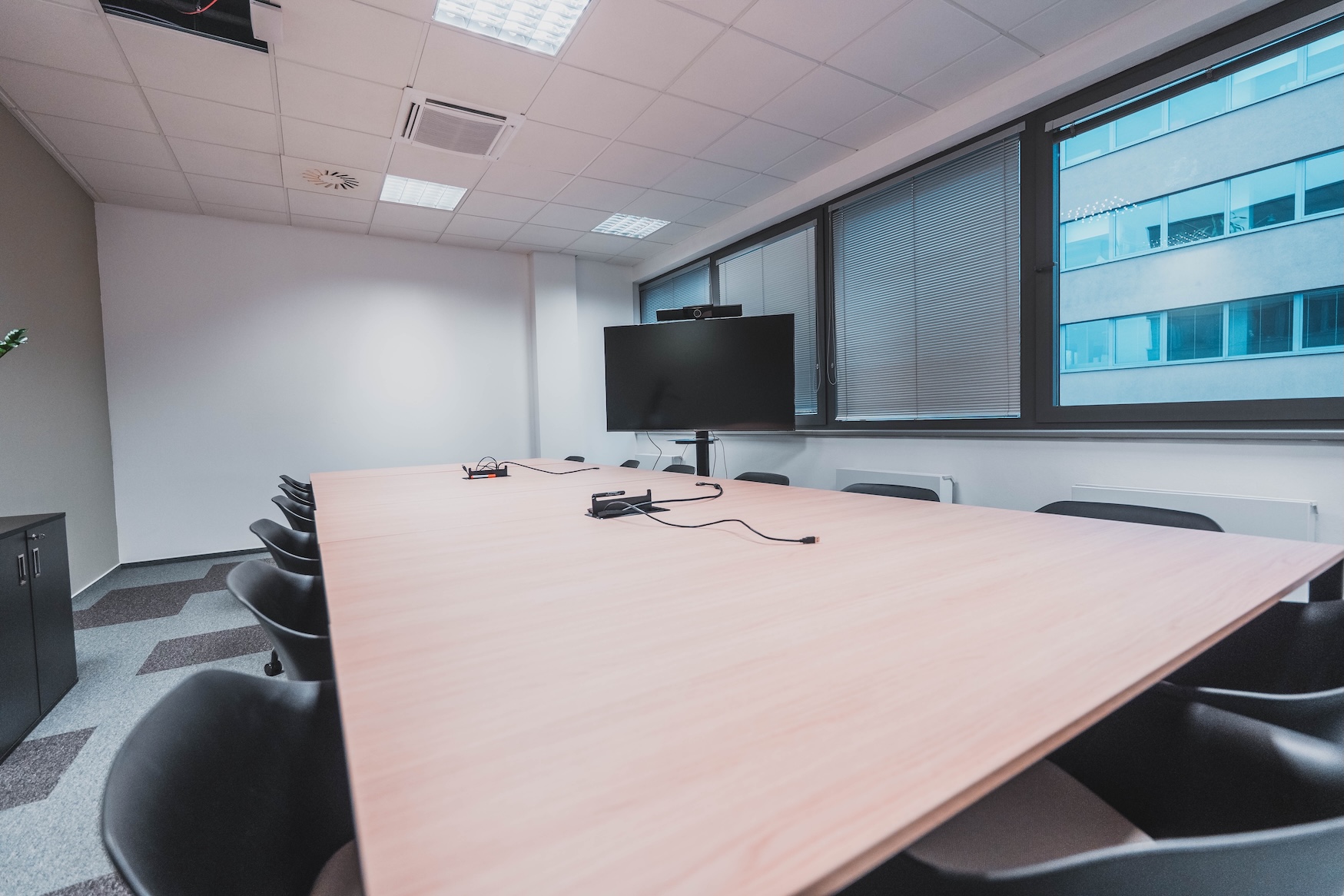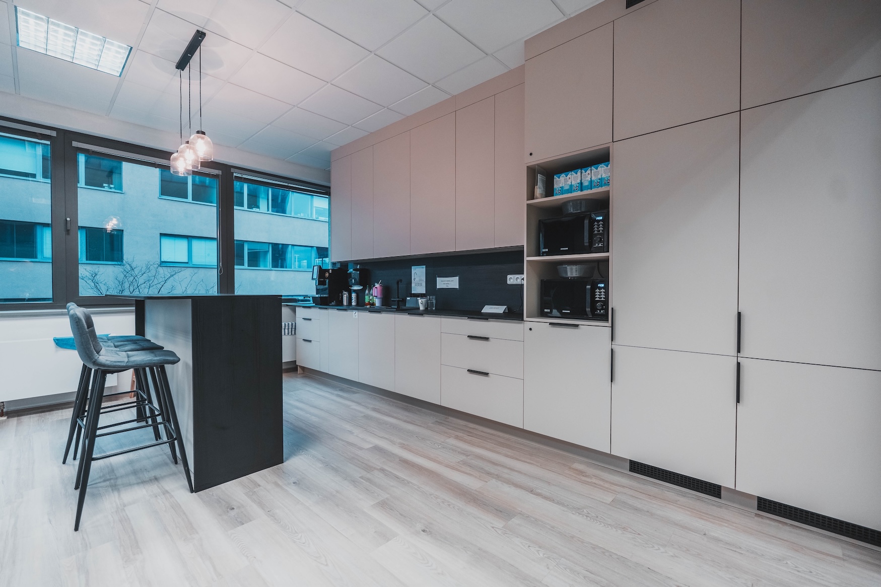 Součástí realizace je také kuchyňka s jídelnou, která slouží nejen pro každodenní stravování, ale i jako přirozené místo setkávání a neformální komunikace. Dále jsme vybavili jednací místnosti určené pro interní porady i schůzky s klienty, kde byl kladen důraz na reprezentativní vzhled, akustický komfort a funkční uspořádání prostoru.