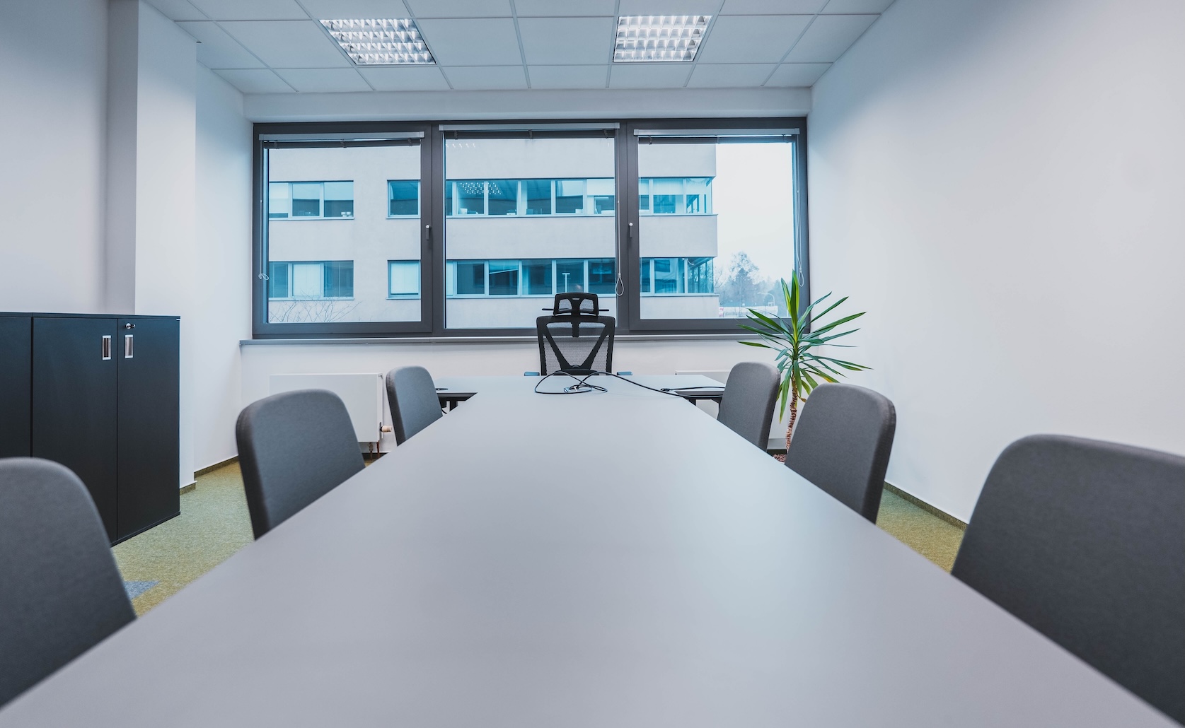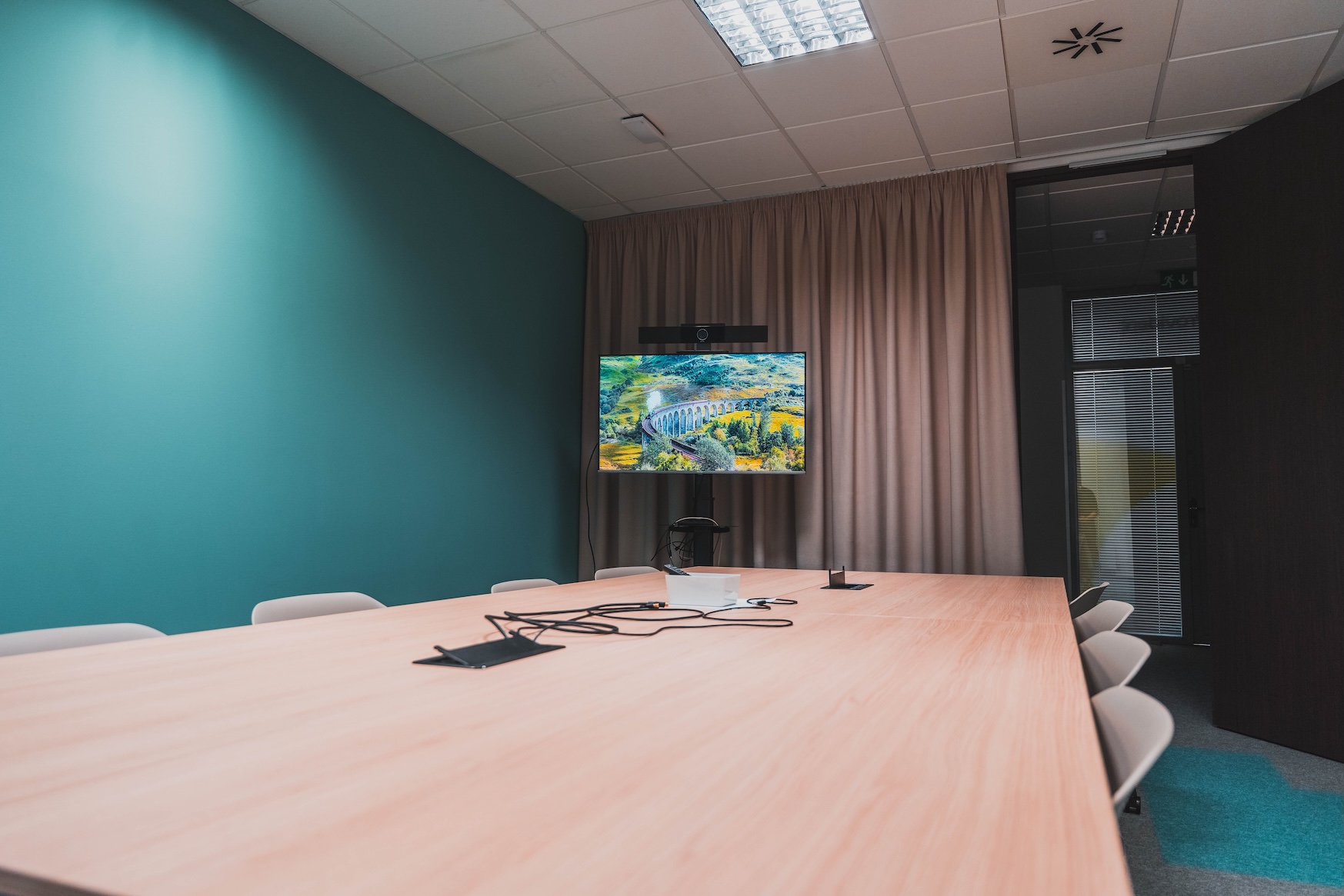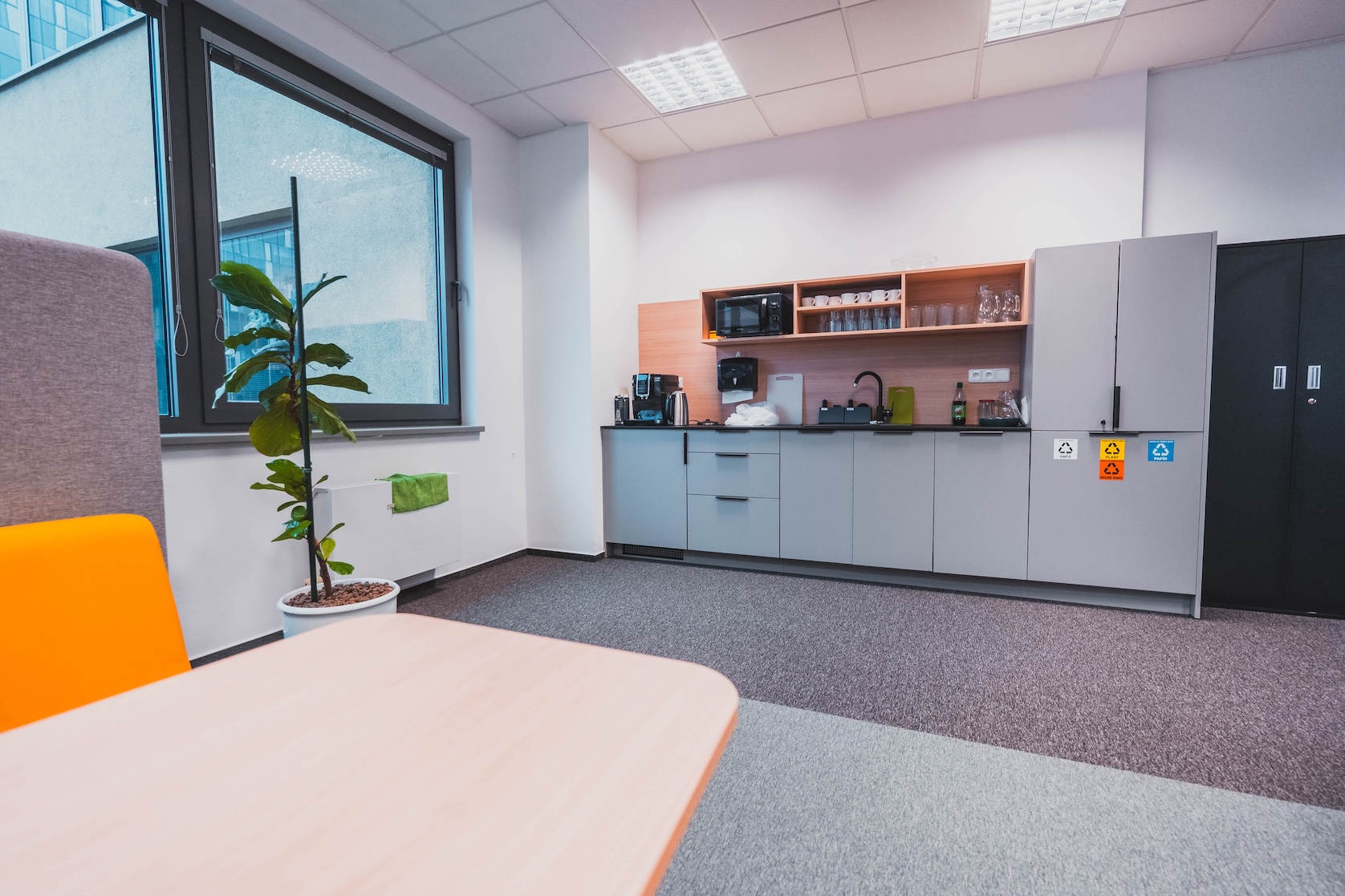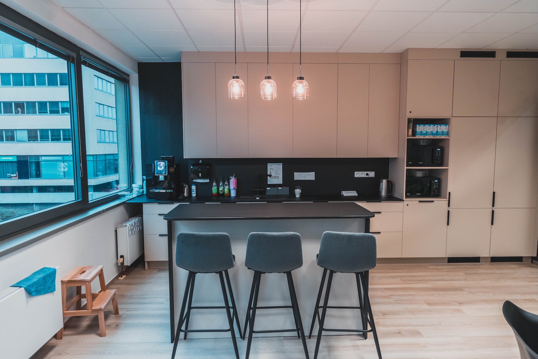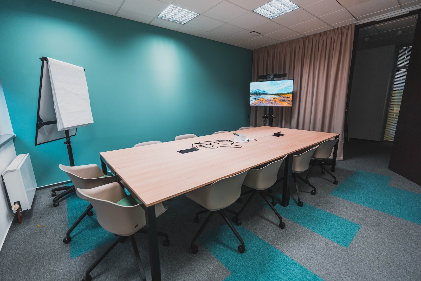 Součástí realizace je také kuchyňka s jídelnou, která slouží nejen pro každodenní stravování, ale i jako přirozené místo setkávání a neformální komunikace. Dále jsme vybavili jednací místnosti určené pro interní porady i schůzky s klienty, kde byl kladen důraz na reprezentativní vzhled, akustický komfort a funkční uspořádání prostoru.