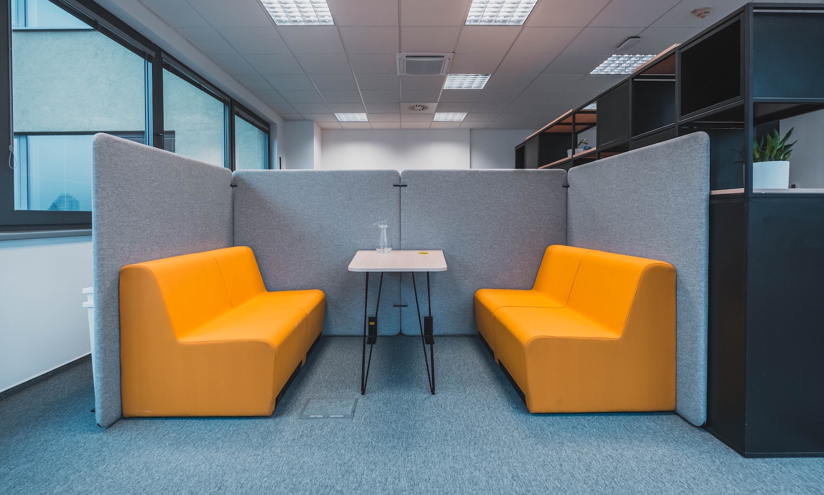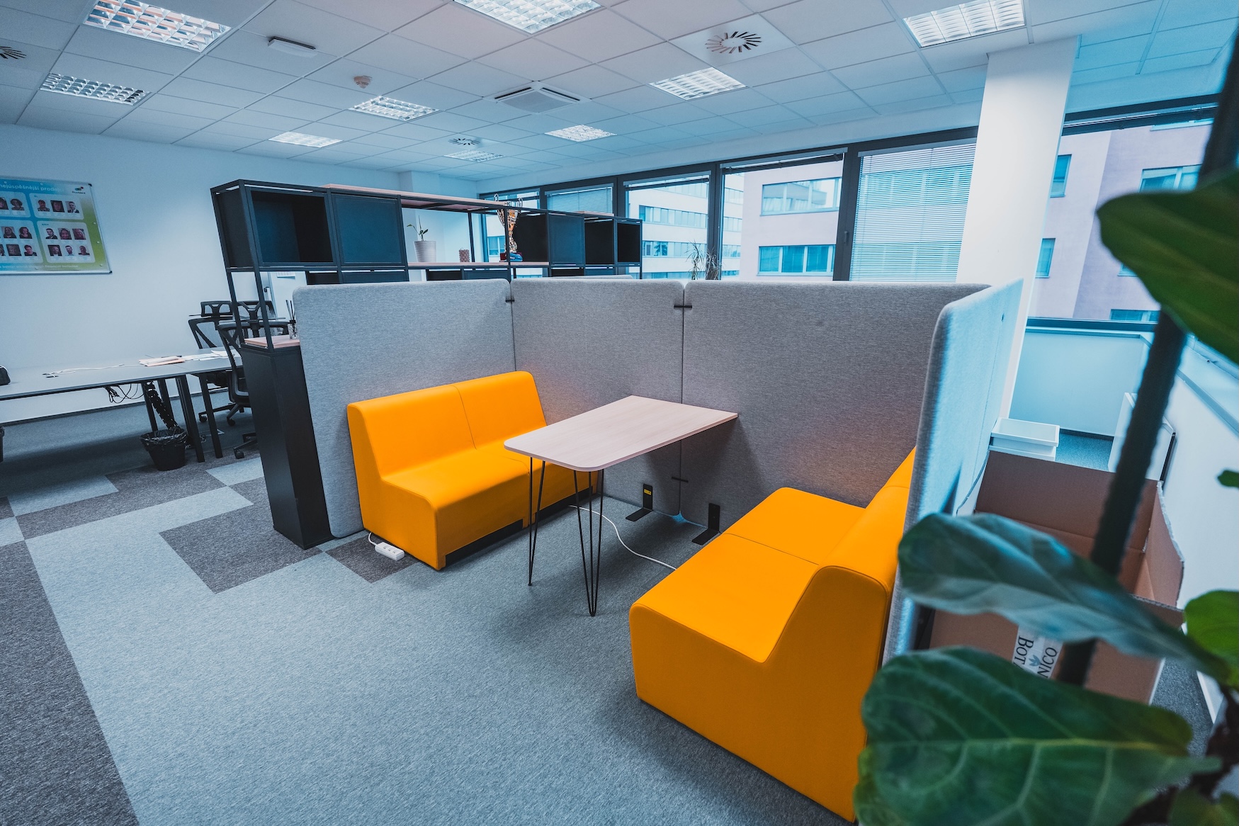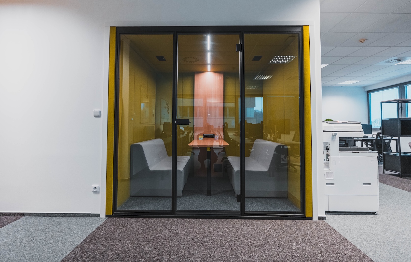 Pro telefonáty a menší meetingy slouží akustické budky, jejichž výběr, dodání a montáž byla plně v naší režii.
