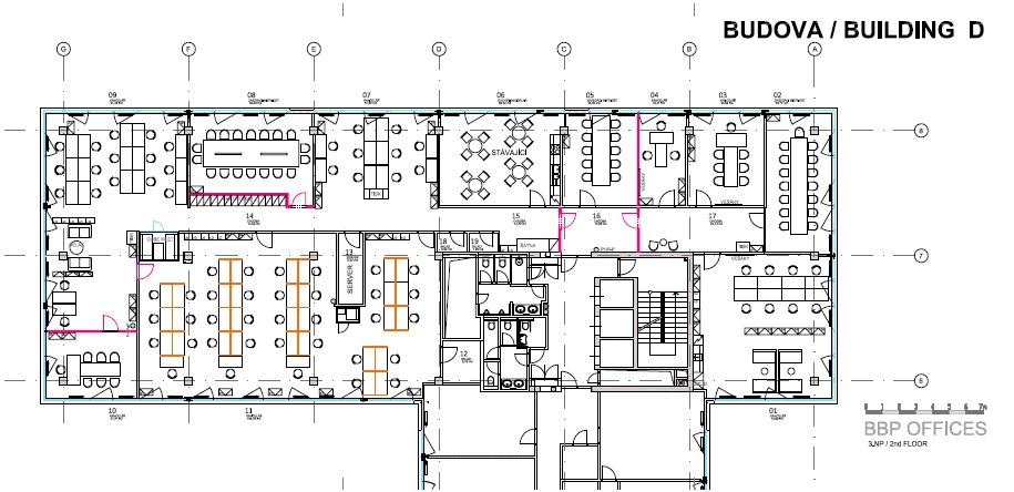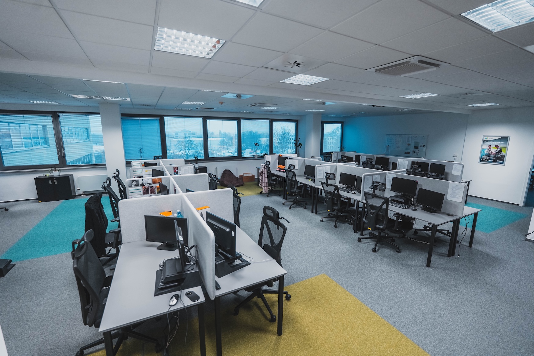 Základem kancelářské části jsou pracovní místa pro celkem 80 osob, vybavená pevnými kancelářskými stoly a ergonomickými židlemi Kolinn. Ty byly zvoleny s ohledem na zdravé sezení, vysokou odolnost a komfort při celodenní práci. Dispozice pracovišť podporuje přehlednost, efektivitu i dostatek osobního prostoru pro každého zaměstnance.